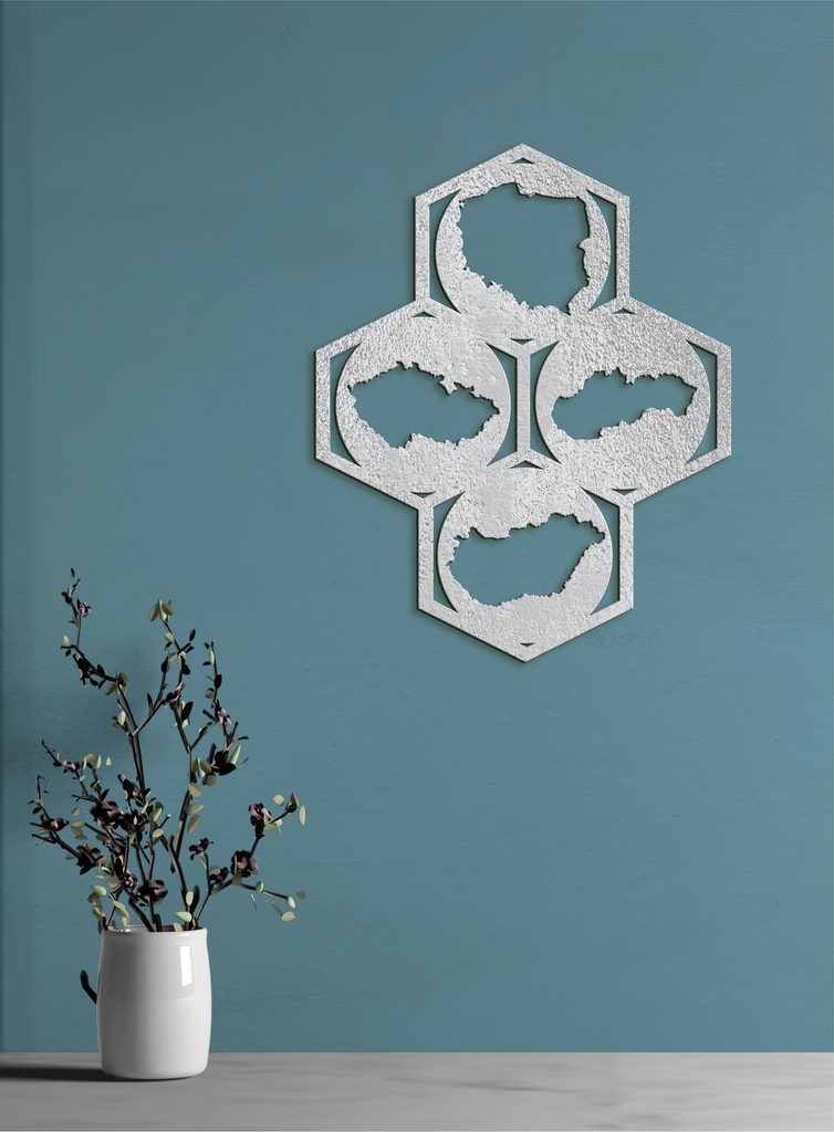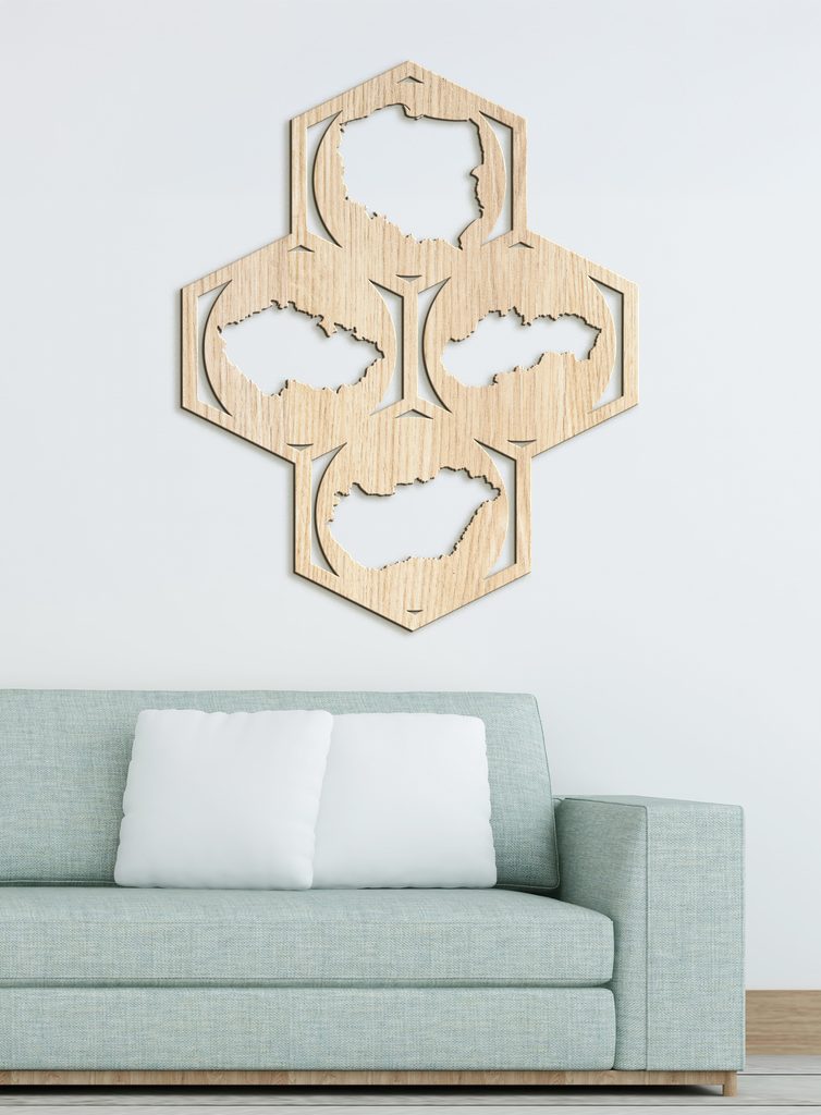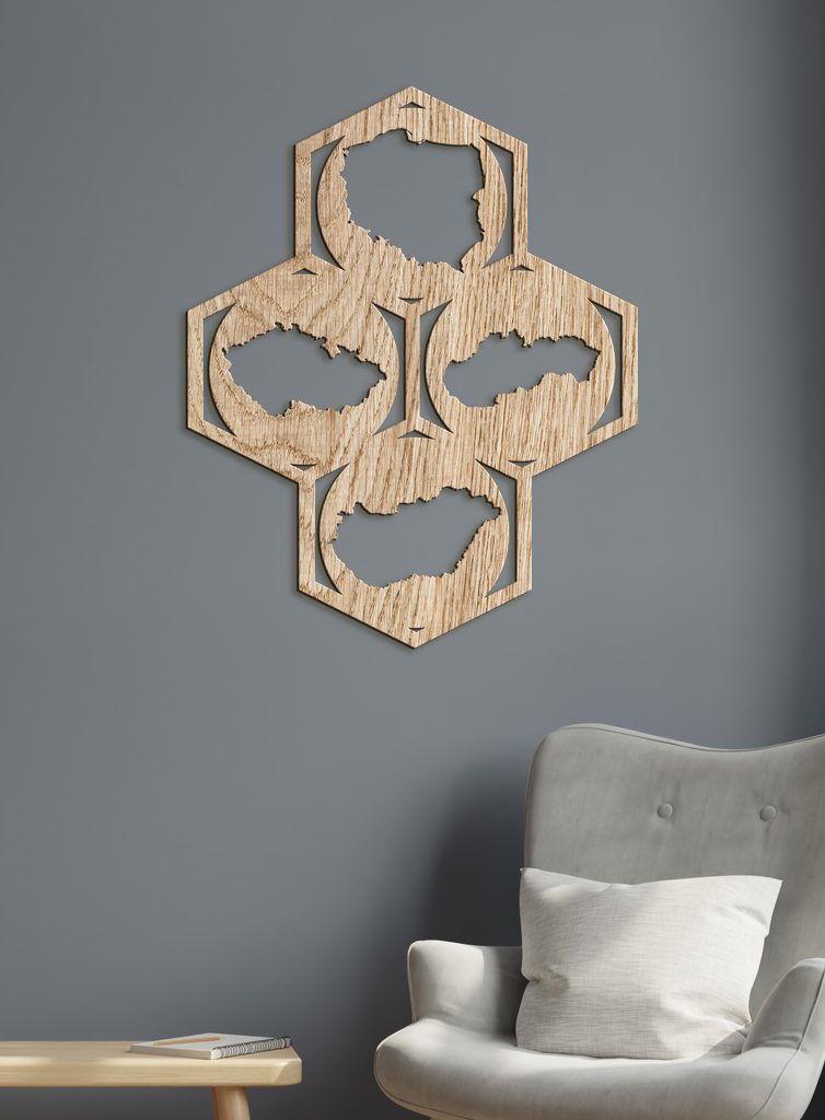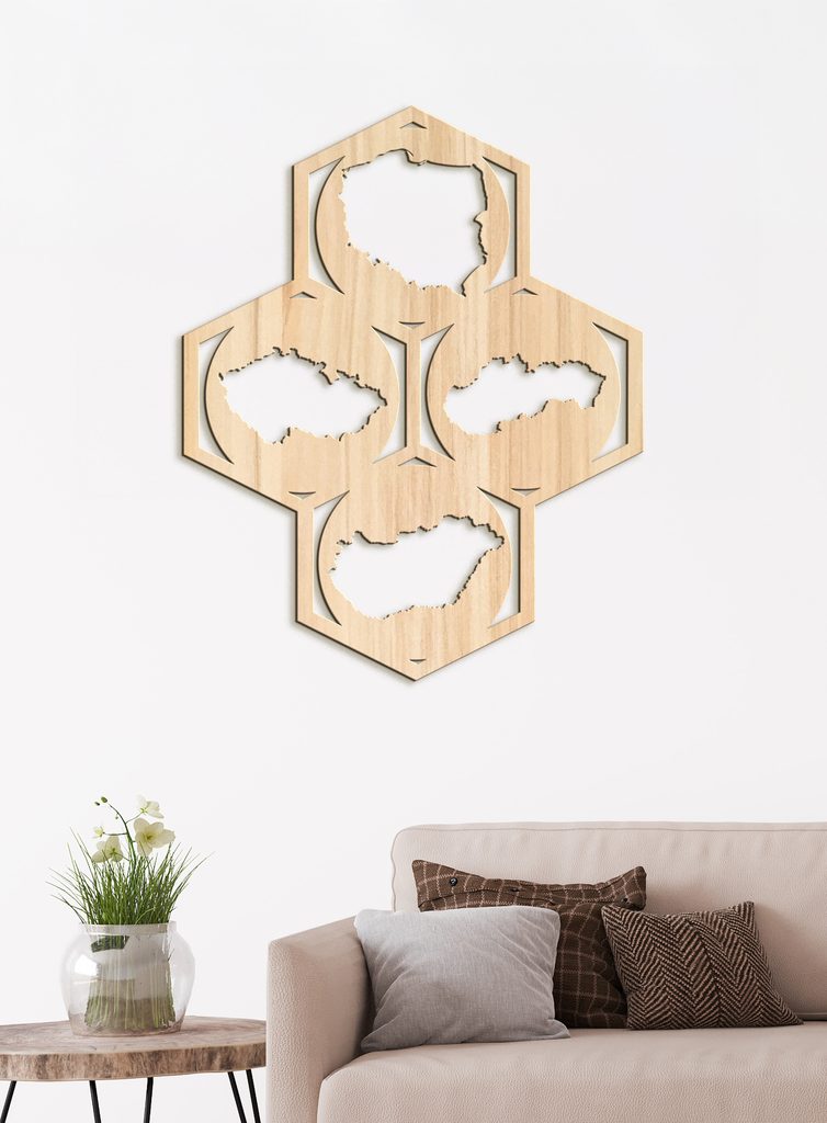 Náš dřevěný nástěnný obraz Mapy je dokonalým dekorativním prvkem pro váš domov, kancelář nebo jakýkoli jiný prostor. Design se skládá ze čtyř šestiúhelníků uspořádaných do většího šestiúhelníkového vzoru. Každý šestiúhelník obsahuje siluetu jedné země: Polska, České republiky, Slovenska a Maďarska. Doplňte svůj prostor tímto uměleckým dílem a nechte ho zazářit na stěně.