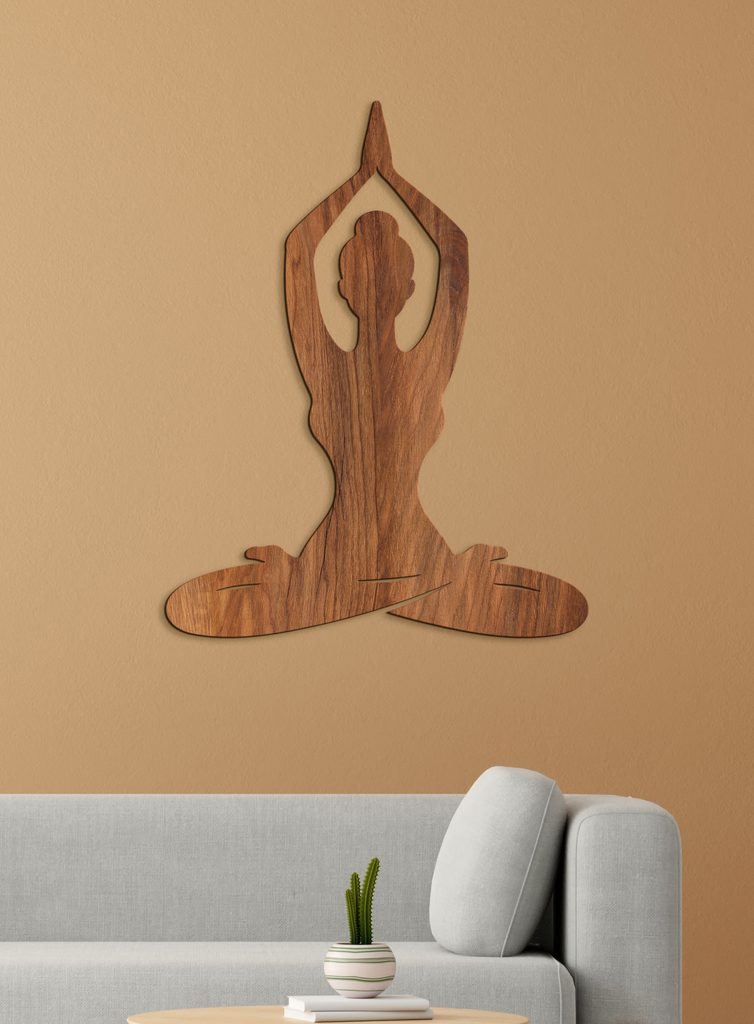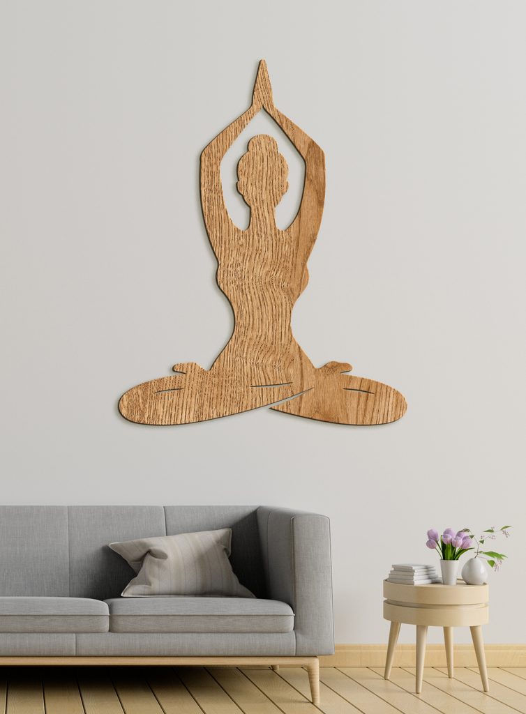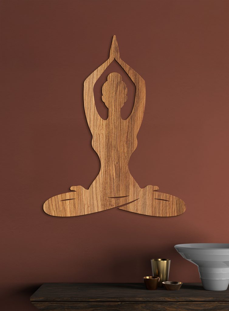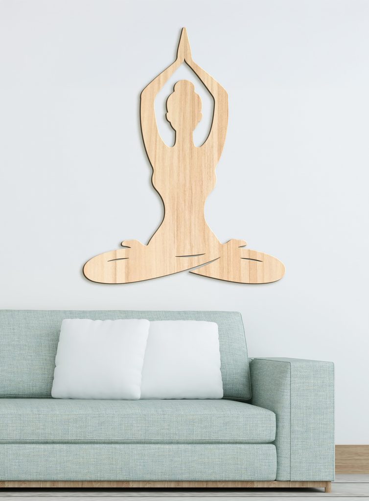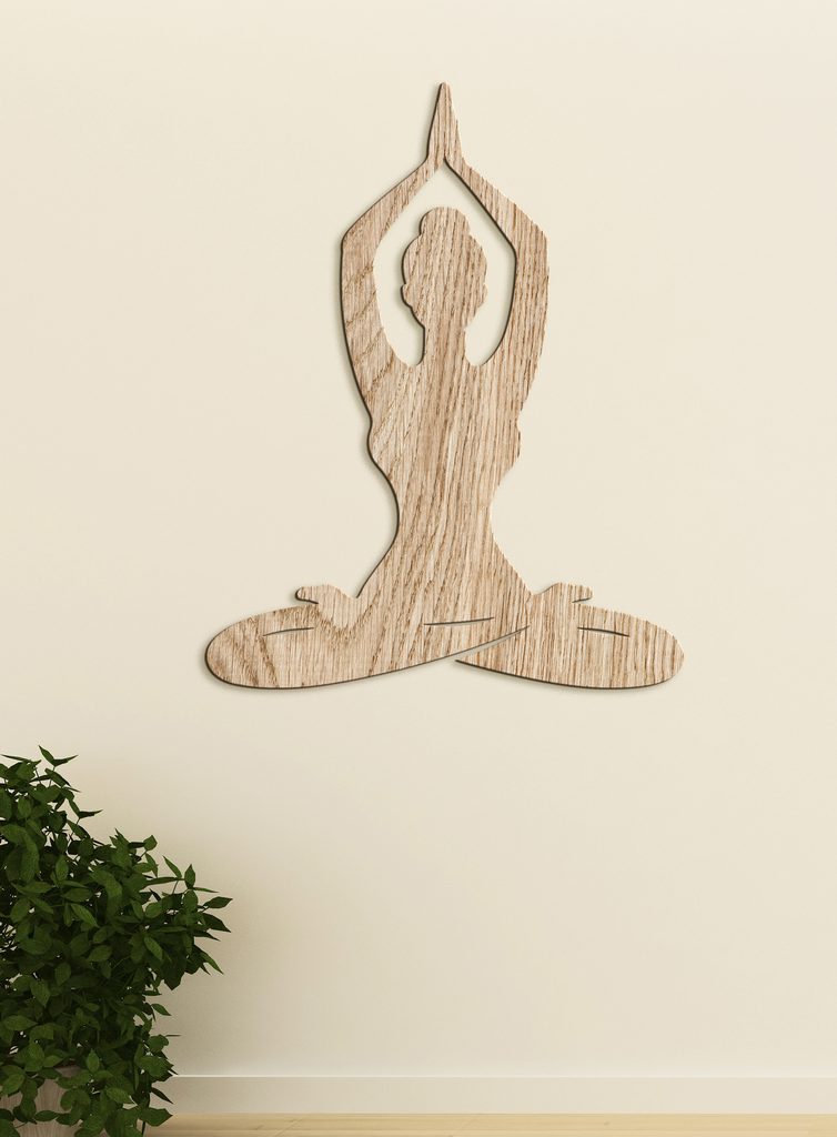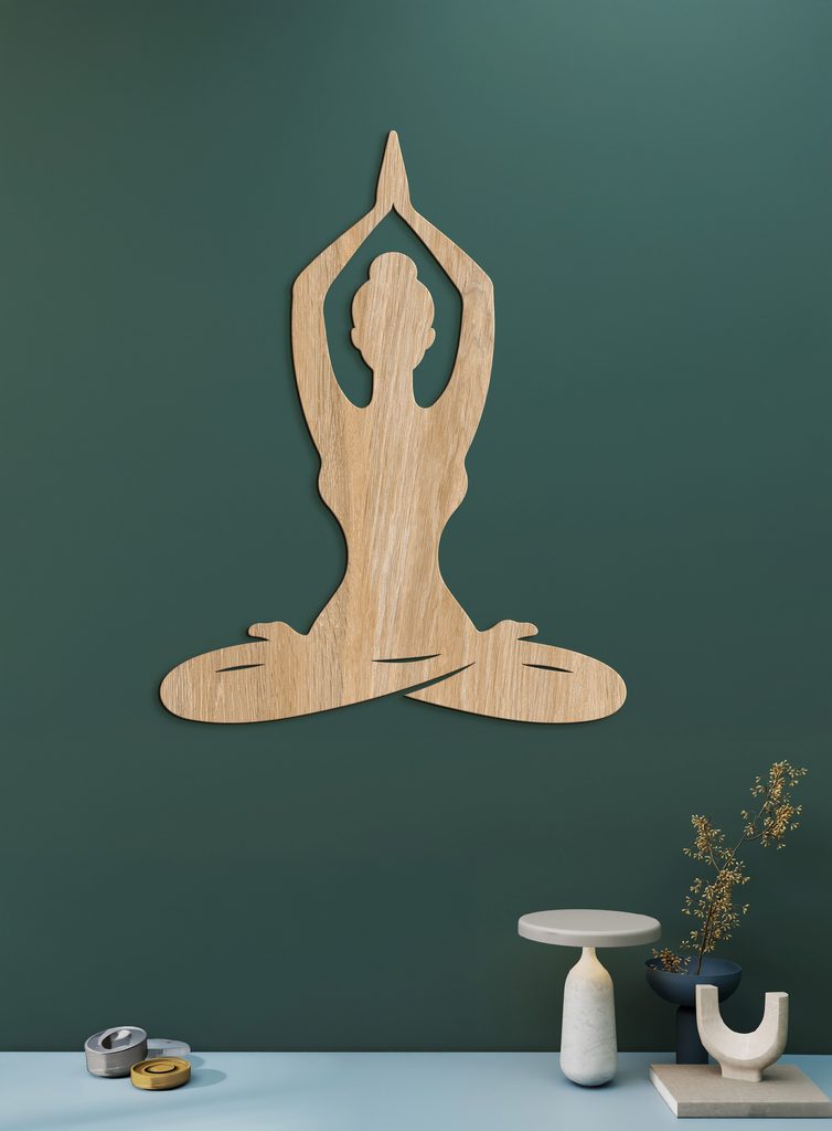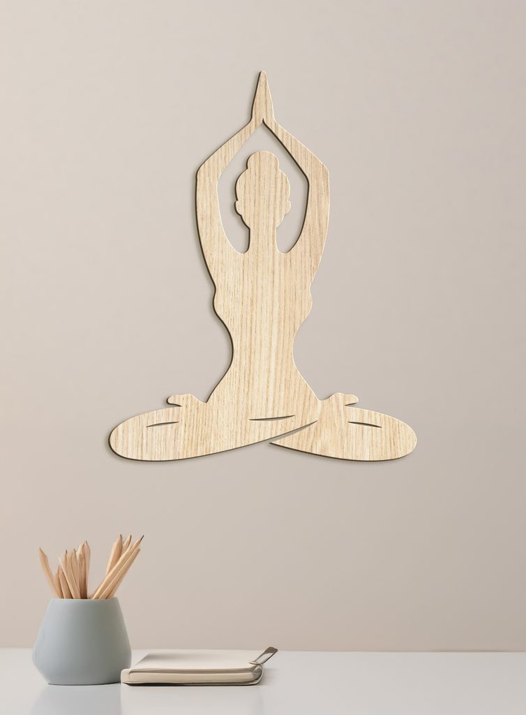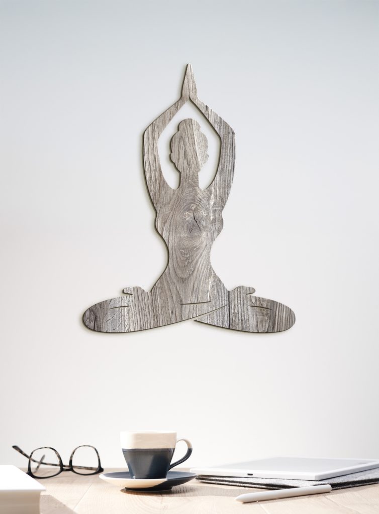 Tento nádherný dekorativní dřevěný obraz na zeď zobrazuje osobu v klidné pozici pro jógu, konkrétně v pozici lotosu.