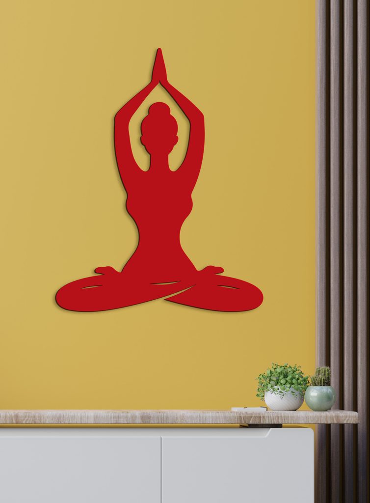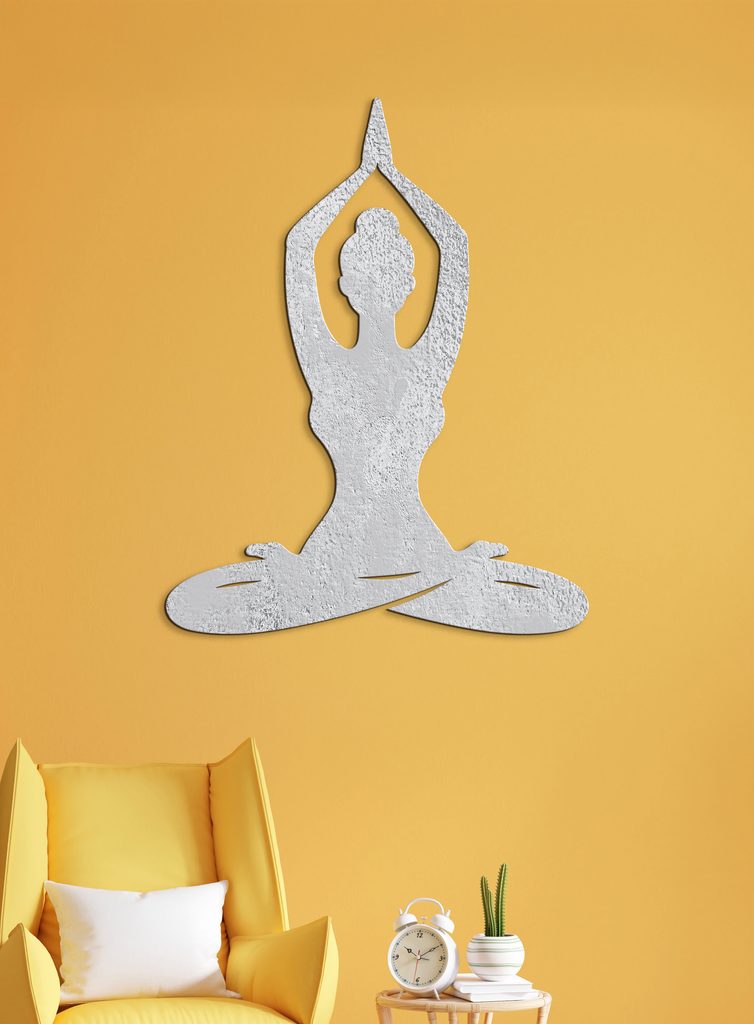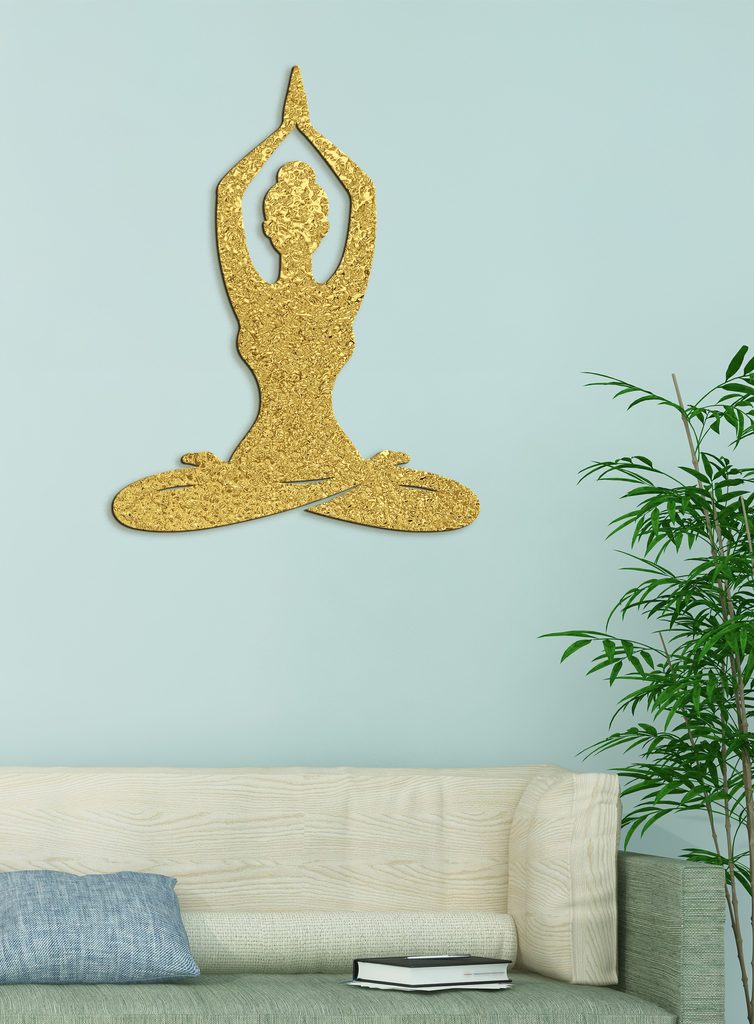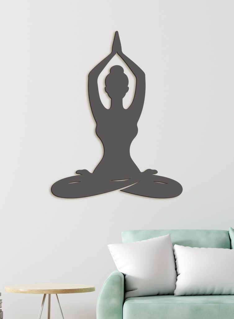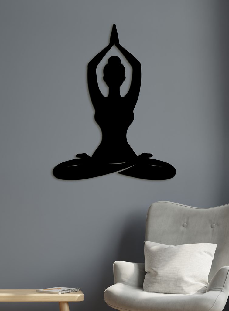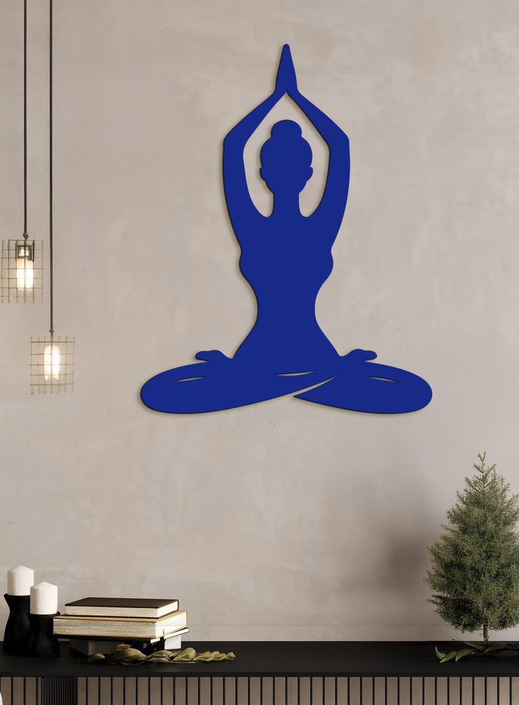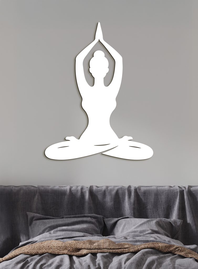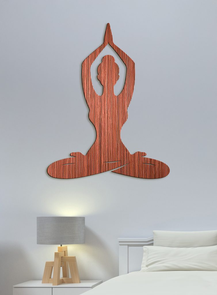 Tento nádherný dekorativní dřevěný obraz na zeď zobrazuje osobu v klidné pozici pro jógu, konkrétně v pozici lotosu.