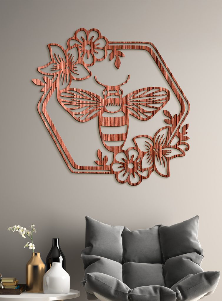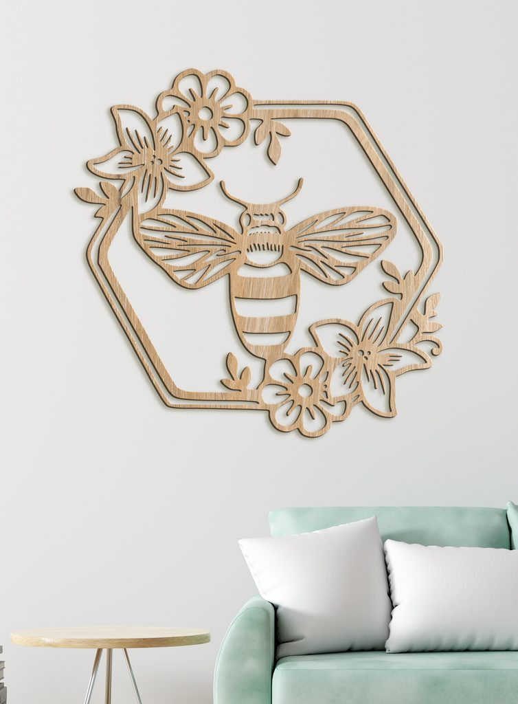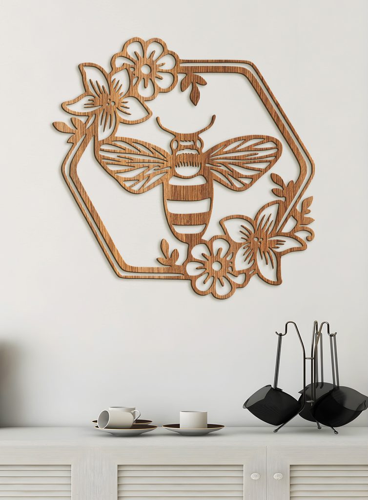 Dřevěný obrázek včely s květinami