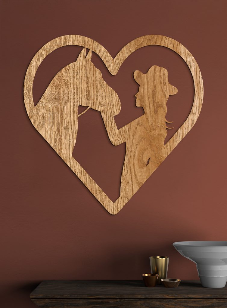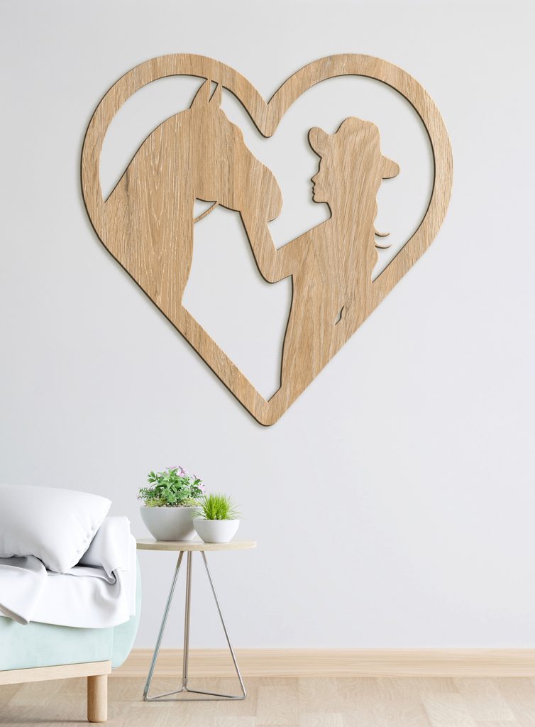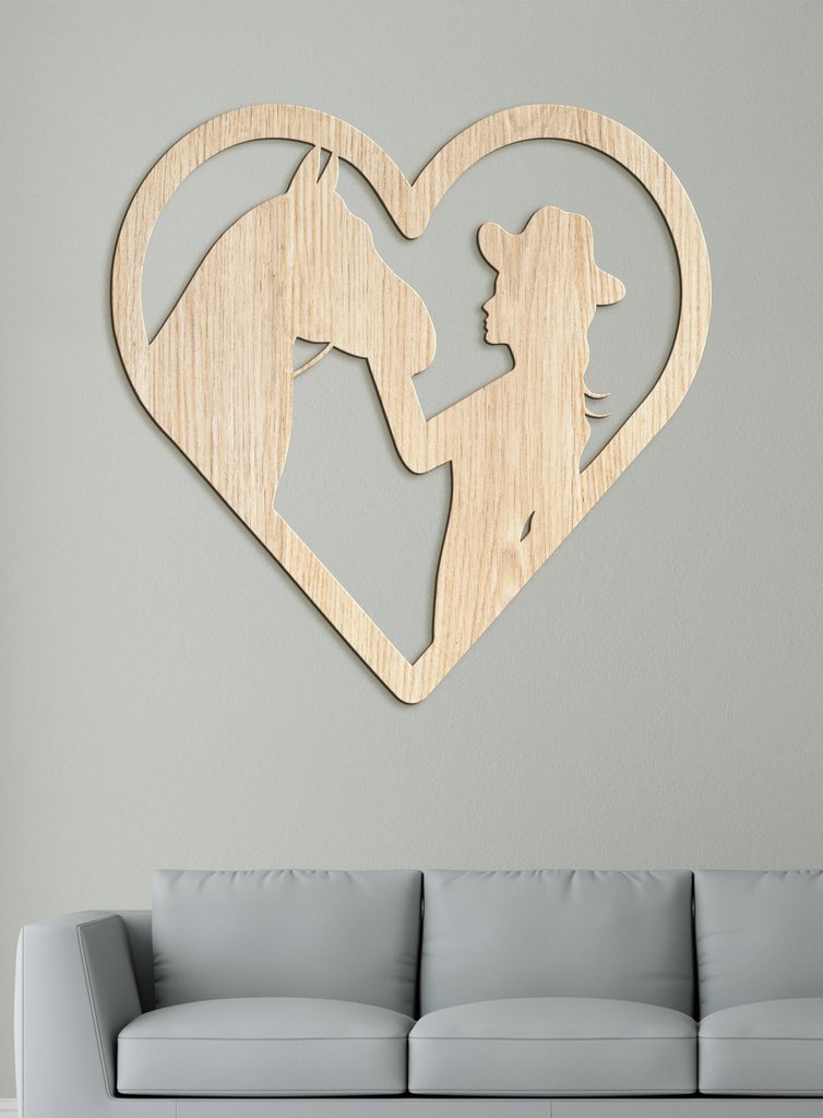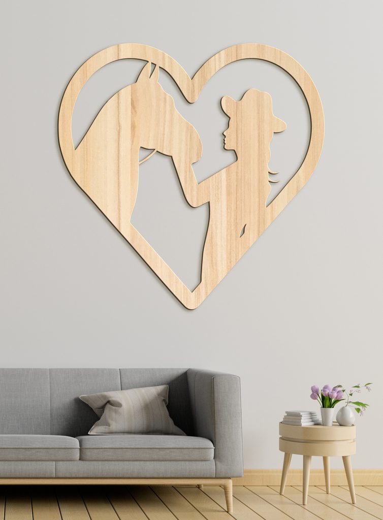 Dodejte svému domovu nádech westernového stylu s tímto elegantním a jedinečným dřevěným obrazem! Silueta osoby v klobouku dotýkající se hlavy koně, umístěná ve tvaru srdce, je dokonalým vyjádřením lásky ke zvířatům a přírodě.