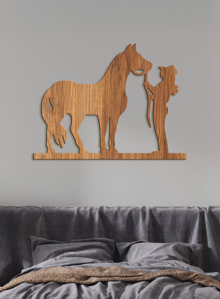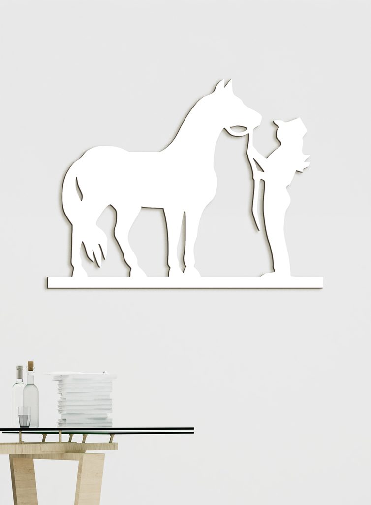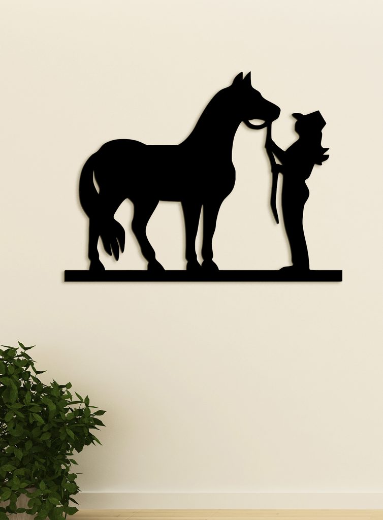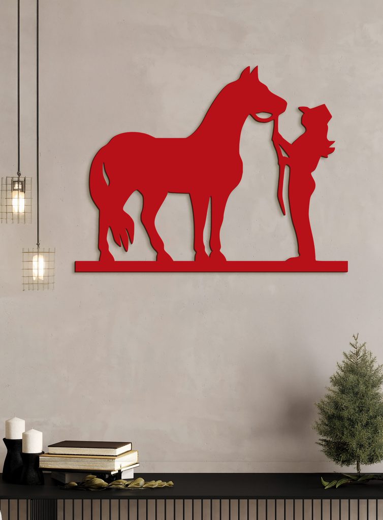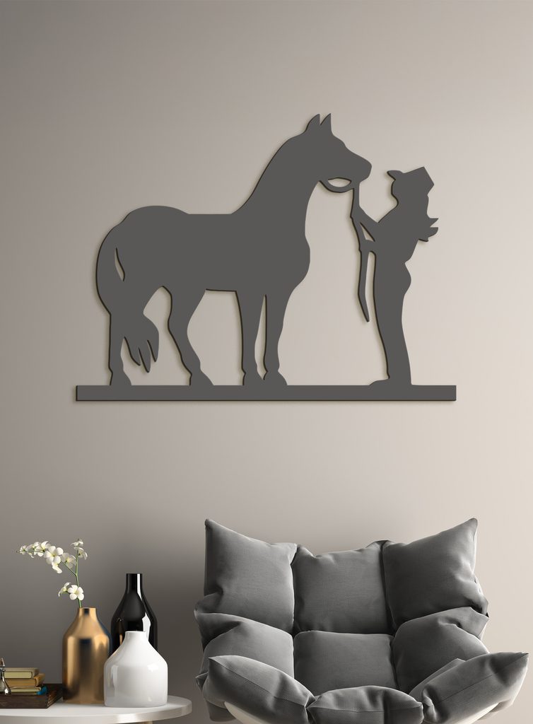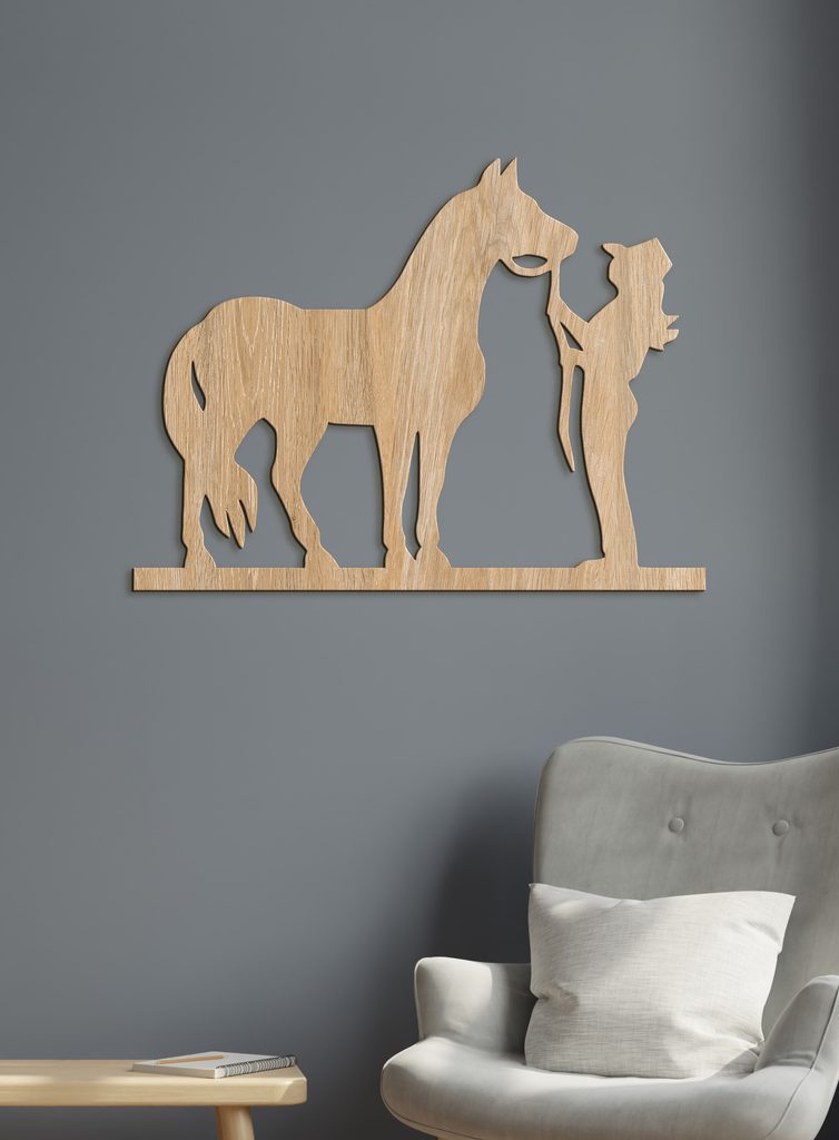 Tento úžasný dřevěný obraz z HDF dřeva zobrazuje siluetu muže stojícího vedle koně. Jezdec drží koně za uzdu a znázorňuje hluboké pouto a komunikaci mezi člověkem a zvířetem.