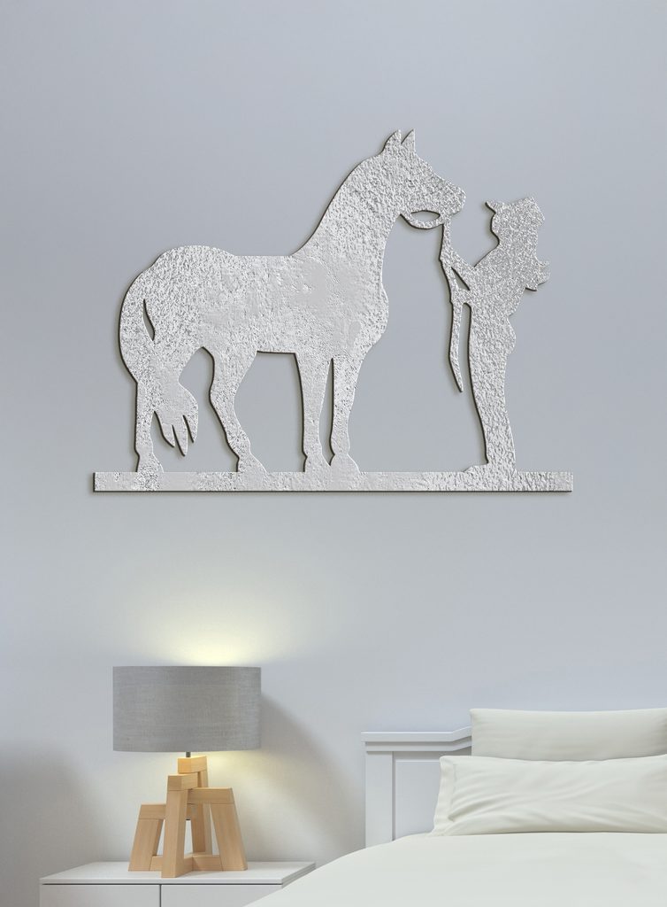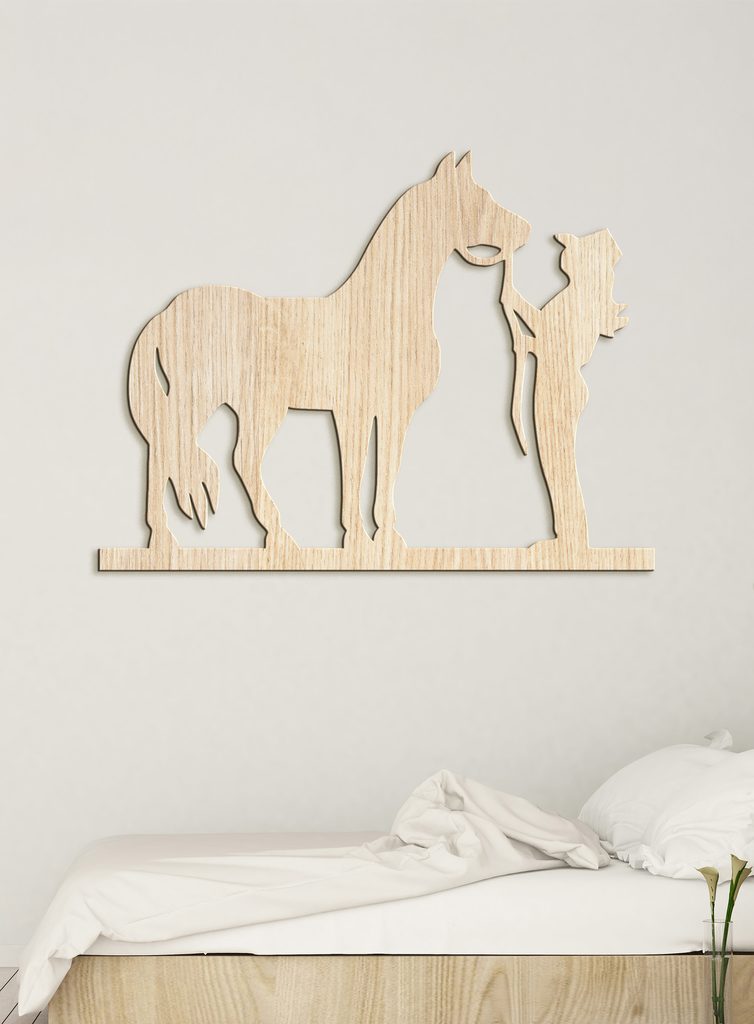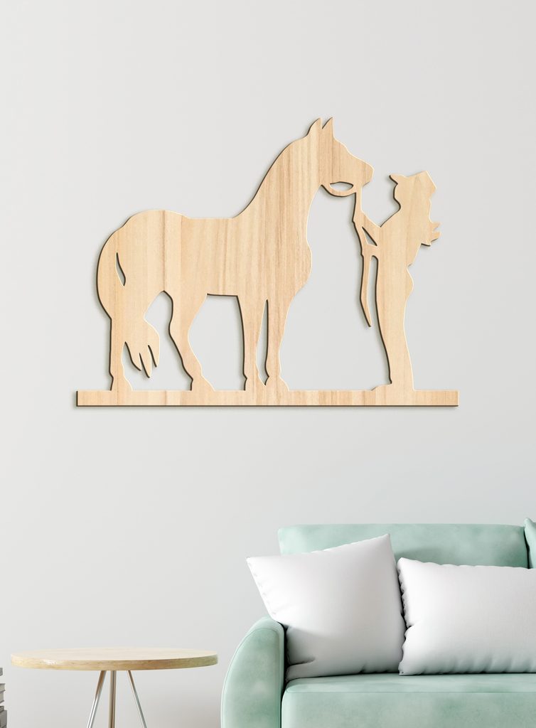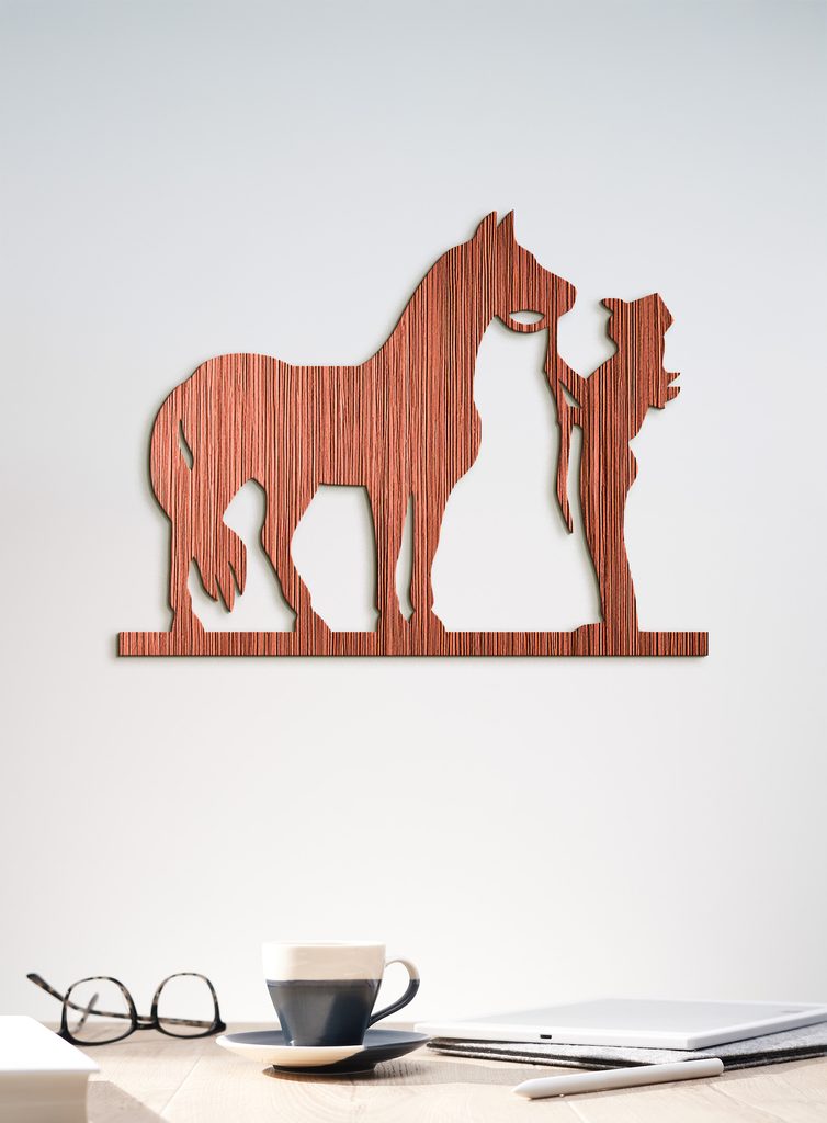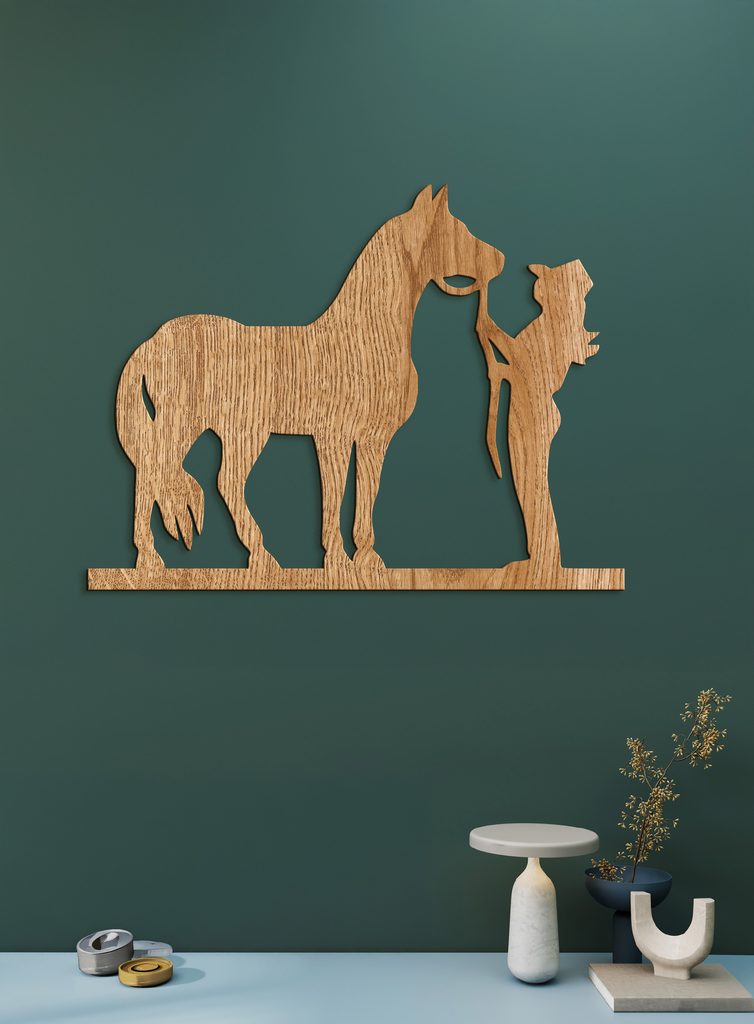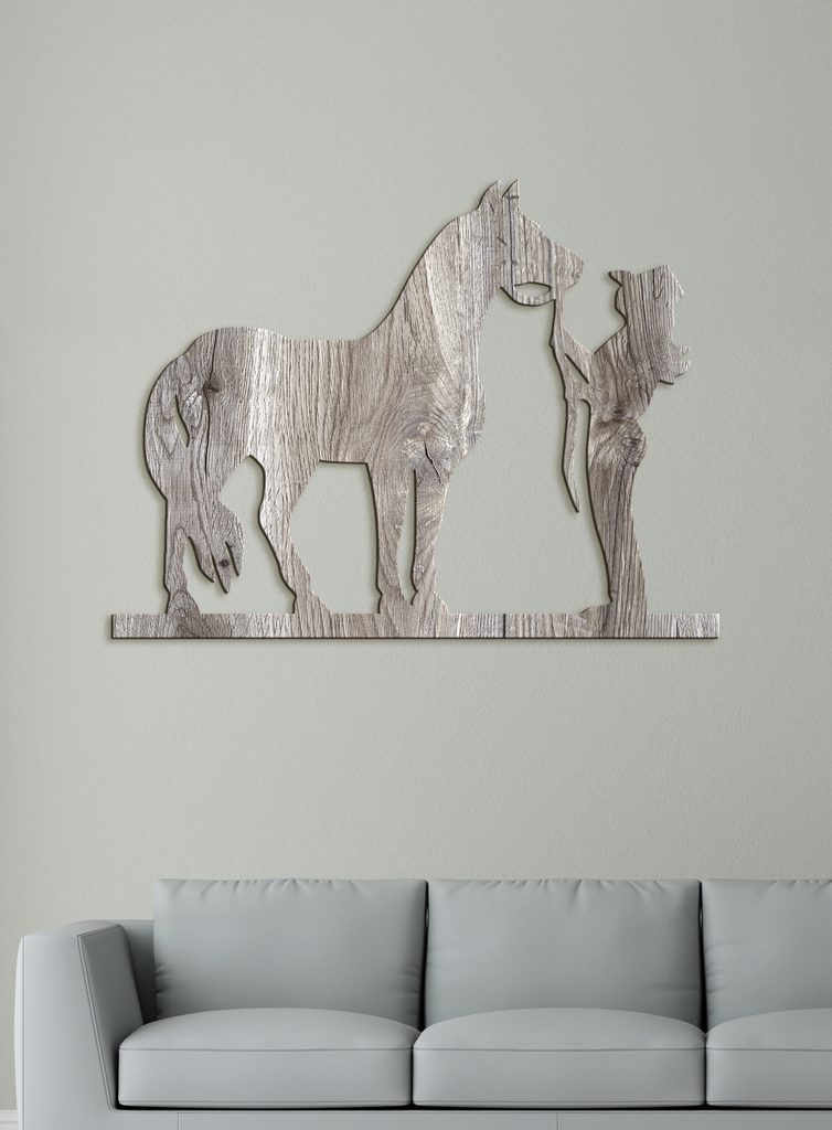 Tento úžasný dřevěný obraz z HDF dřeva zobrazuje siluetu muže stojícího vedle koně. Jezdec drží koně za uzdu a znázorňuje hluboké pouto a komunikaci mezi člověkem a zvířetem.