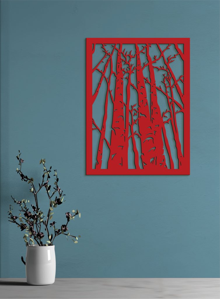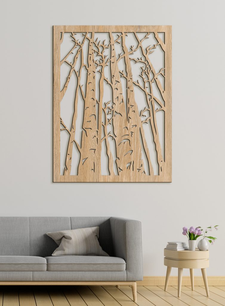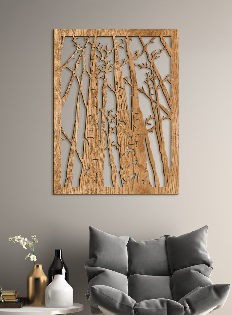 Krásný dřevěný obraz znázorňuje siluetu hustého lesa s vysokými stromy bez listí. Stromy jsou mistrně vyřezávané, což vytváří kontrast mezi dřevem a pozadím a dodává obrazu dojem hloubky a tajemné atmosféry. Rám, který obraz obklopuje, dodává celému dílu elegantní vzhled.