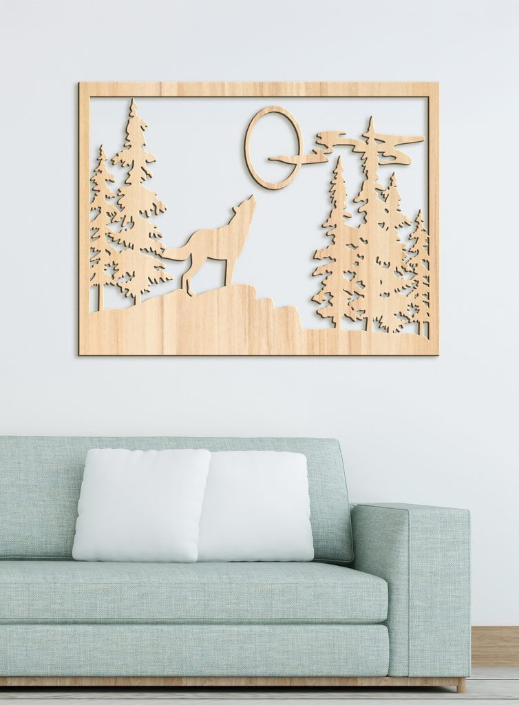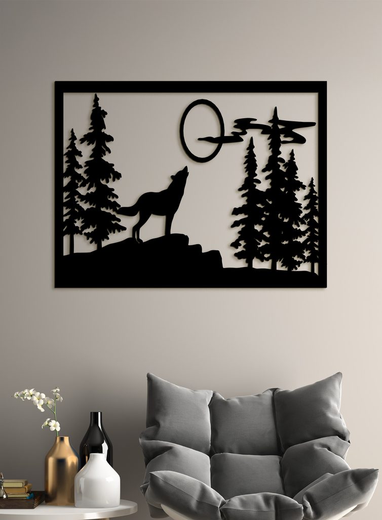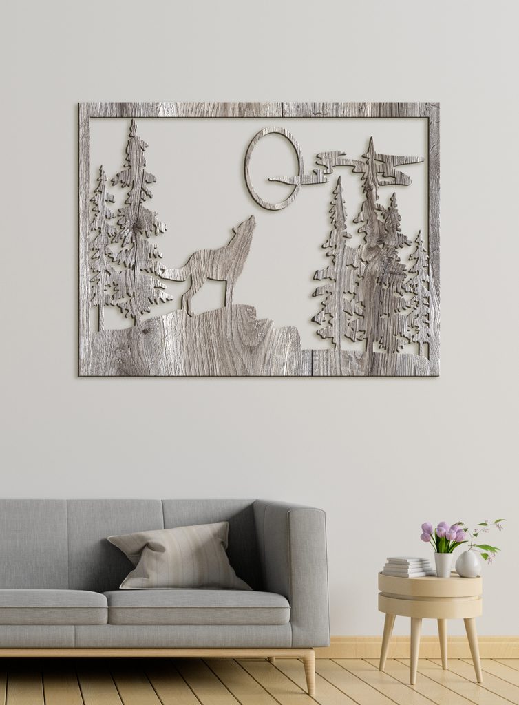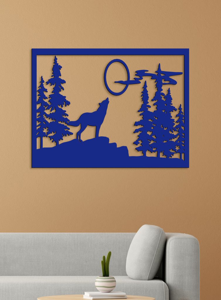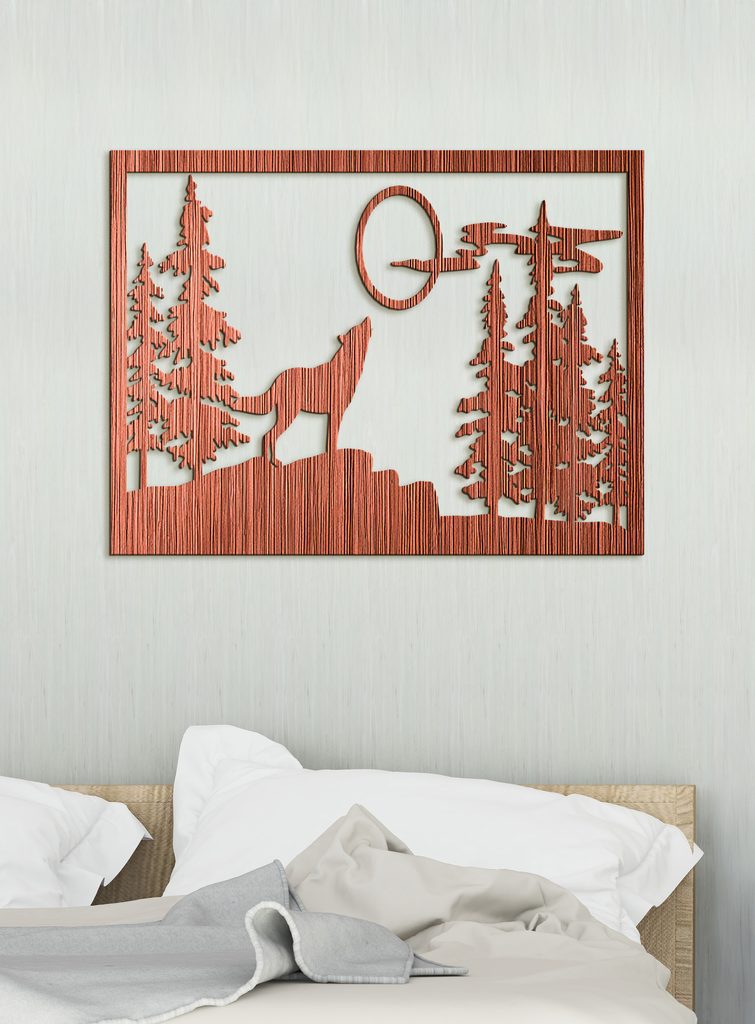 Tento krásný dřevěný obraz zobrazuje siluetu vlka vycházejícího k měsíci, obklopeného borovicemi. Vlk je umístěn na skalnatém výběžku, zatímco měsíc je zobrazen s několika mraky v jeho blízkosti. Tento obraz zobrazuje klasický výjev z divočiny, který je často spojován s tématy přírody, samoty a divočiny.