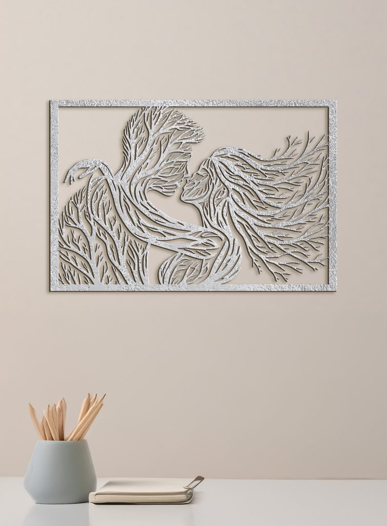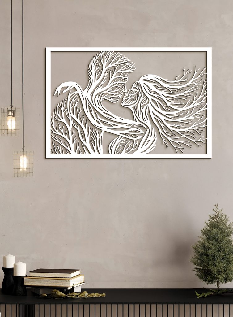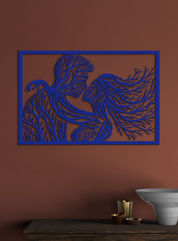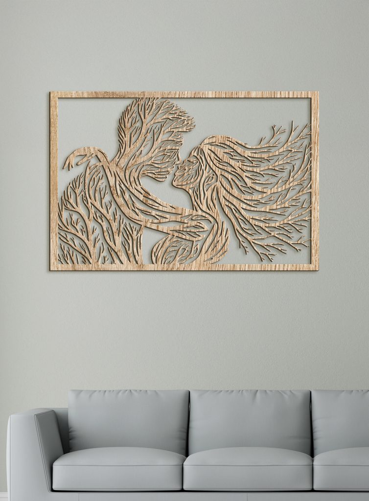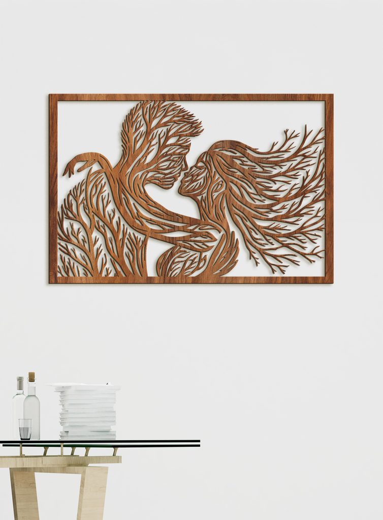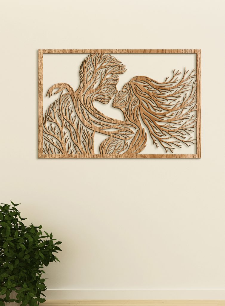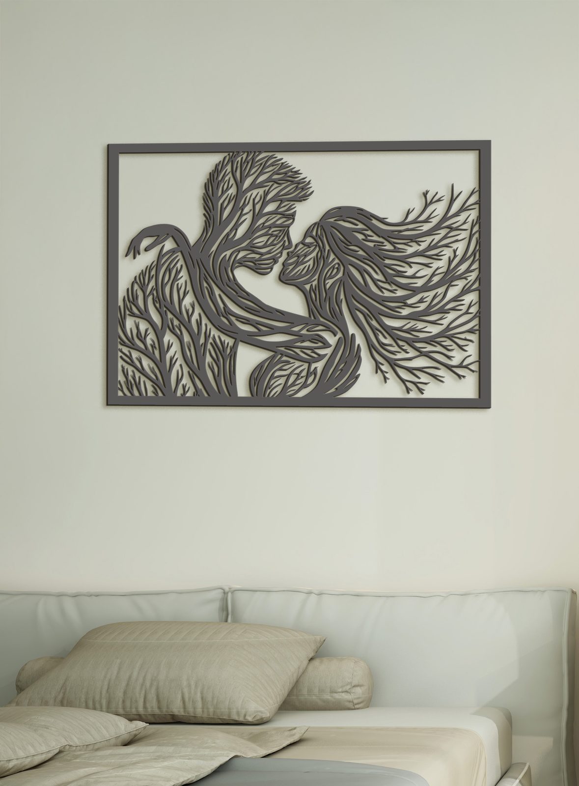 Náš romantický obraz z HDF dřeva zobrazuje dvě lidské postavy z větví a listů stromů. Postavy stojí proti sobě, hlavy mají blízko u sebe, což naznačuje intimní nebo milostný okamžik.