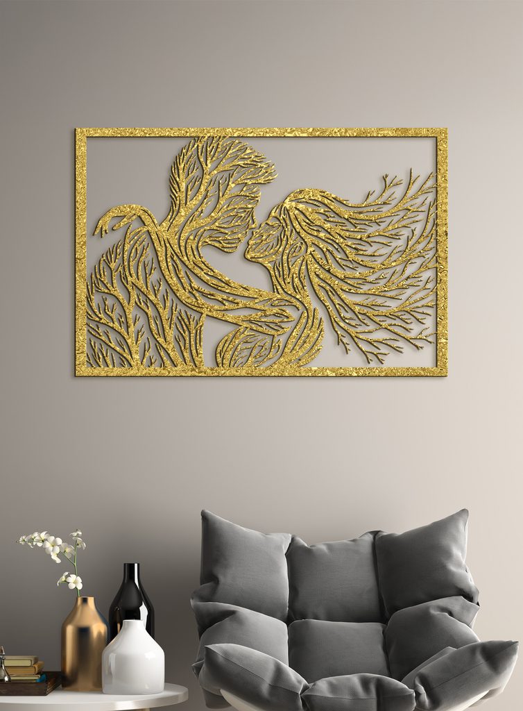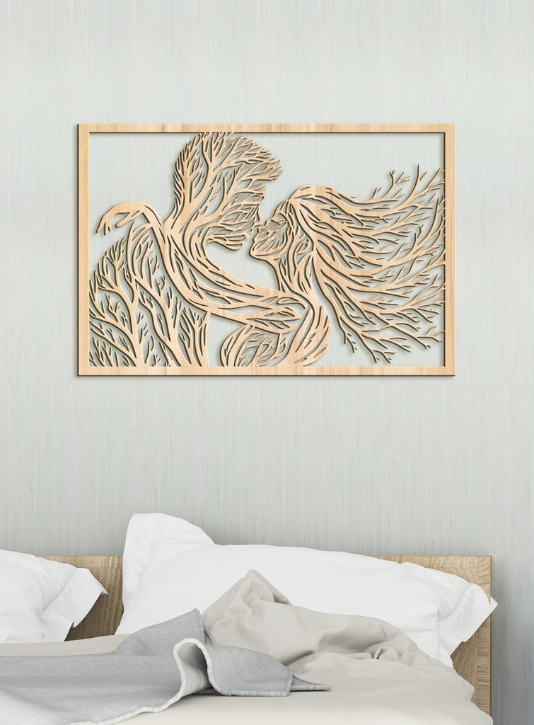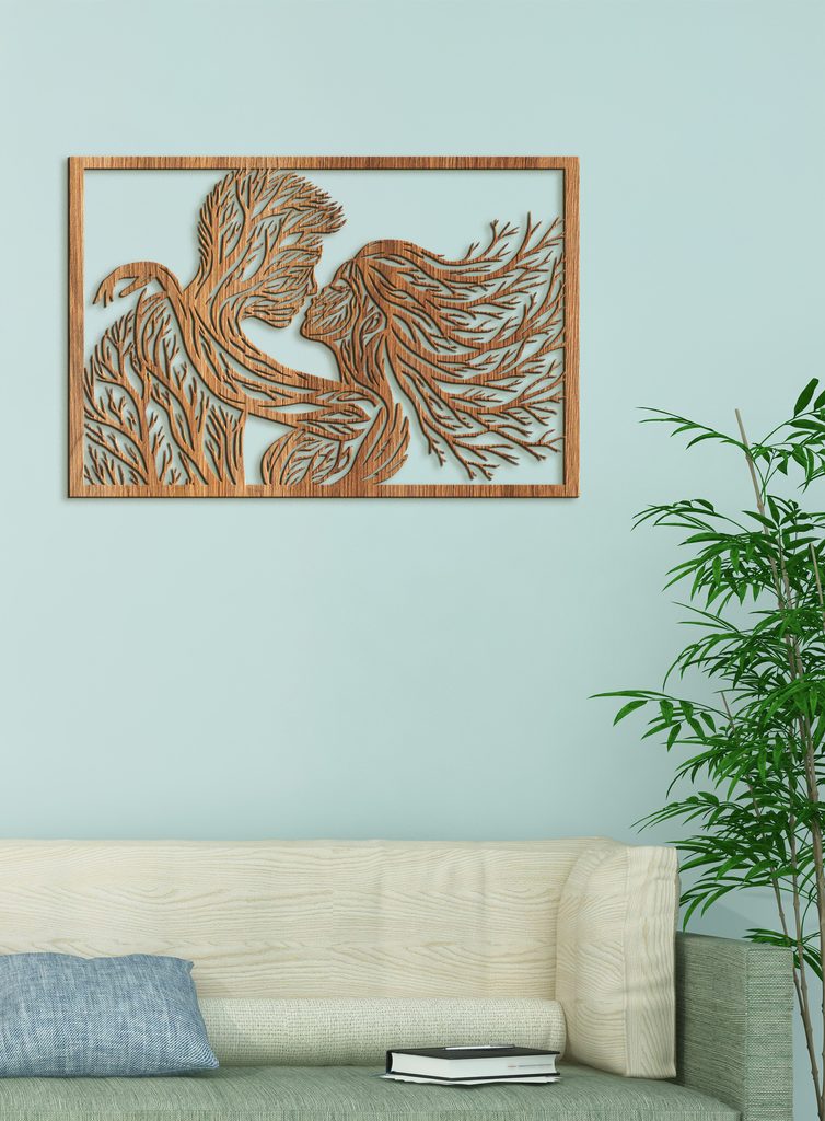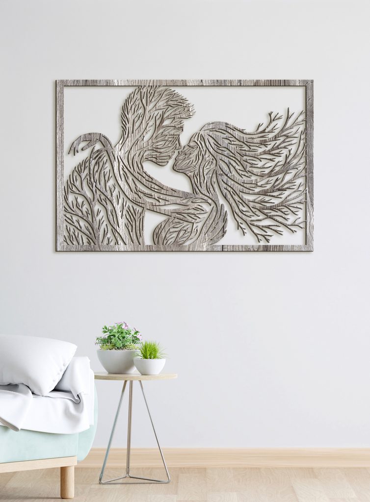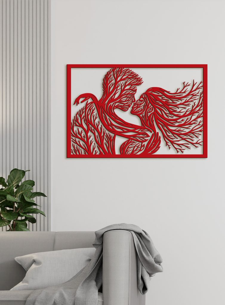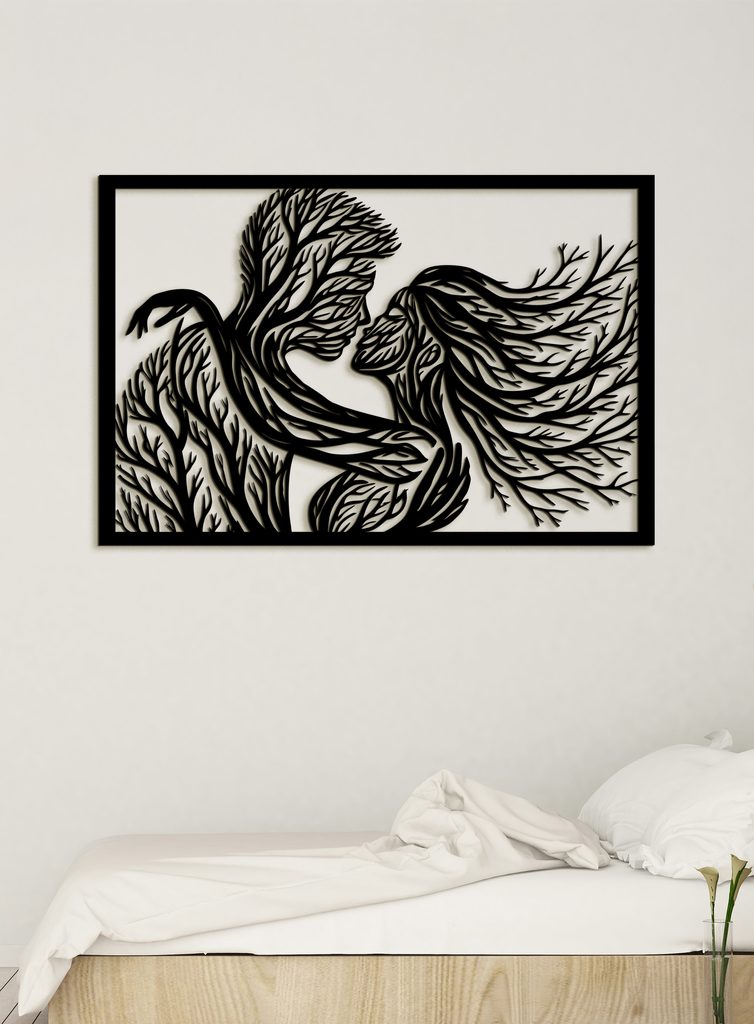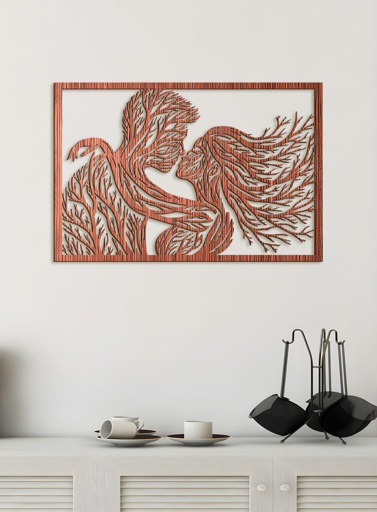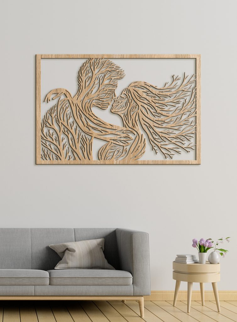 Náš romantický obraz z HDF dřeva zobrazuje dvě lidské postavy z větví a listů stromů. Postavy stojí proti sobě, hlavy mají blízko u sebe, což naznačuje intimní nebo milostný okamžik.