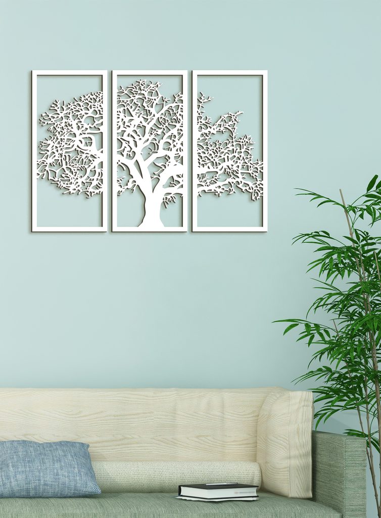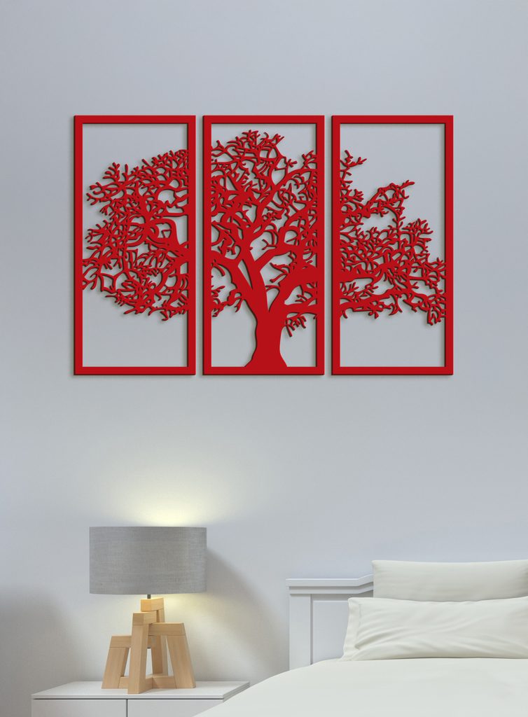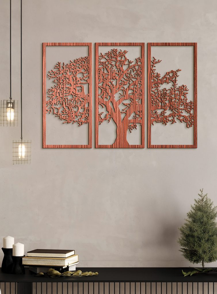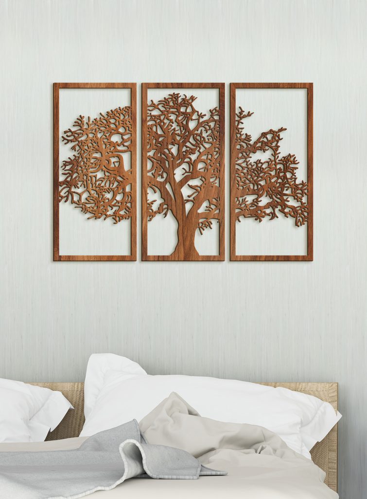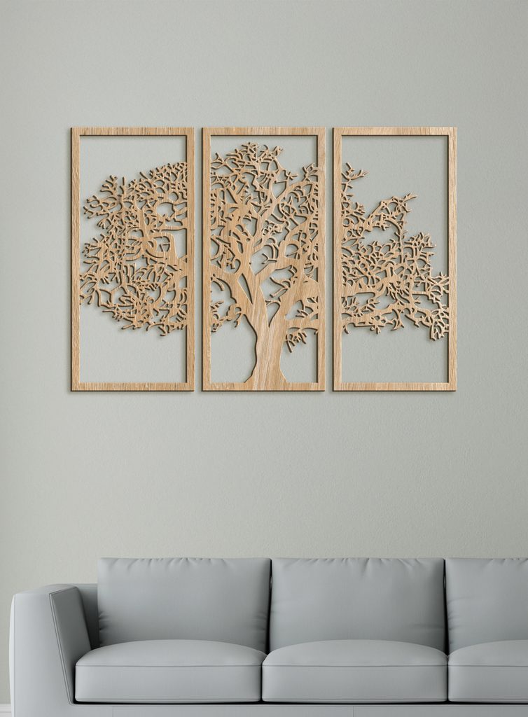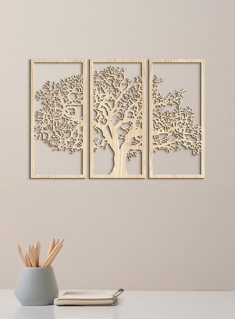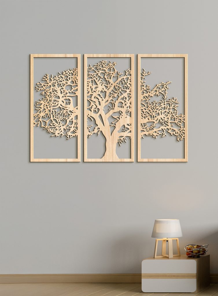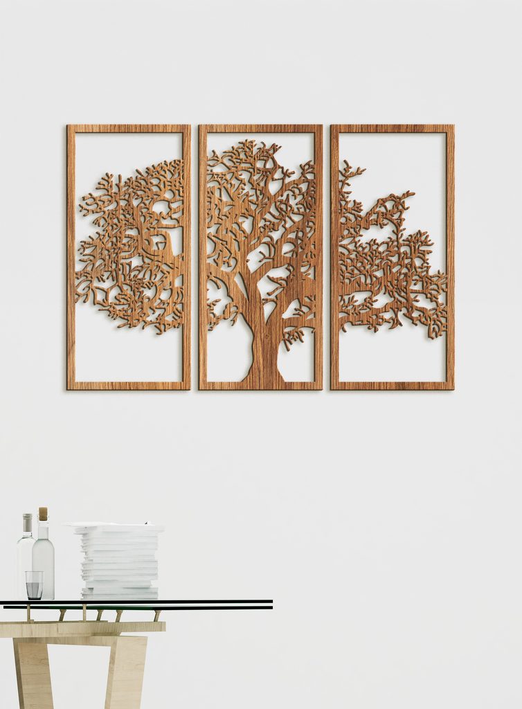 Tento krásný dřevěný obraz zobrazuje siluetu stromu rozdělenou do tří svislých panelů. Každý panel obsahuje část stromu, který má silný kmen a mnoho větví s propracovanými detaily. Když jsou panely umístěny vedle sebe, tvoří ucelený obraz stromu.
