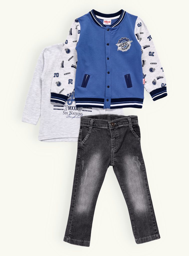 - kalhoty: džínové, zapínání na knoflík, dvě kapsy