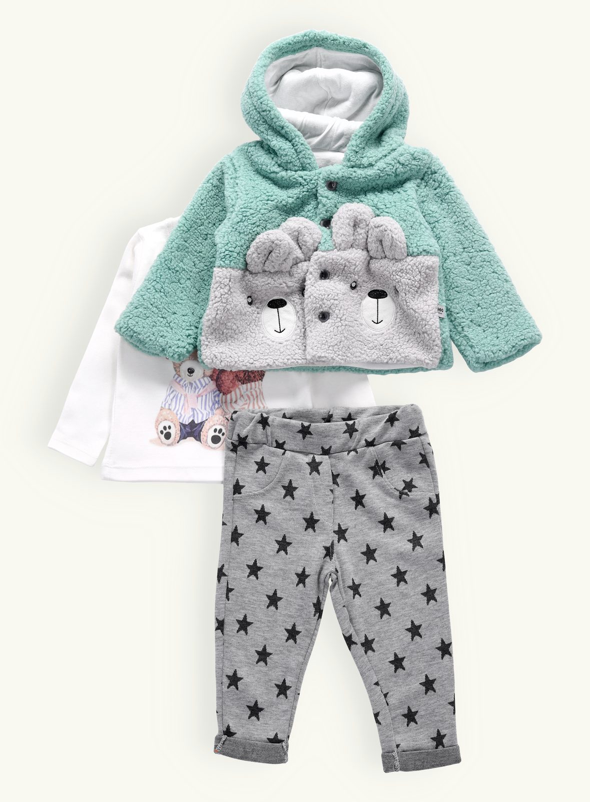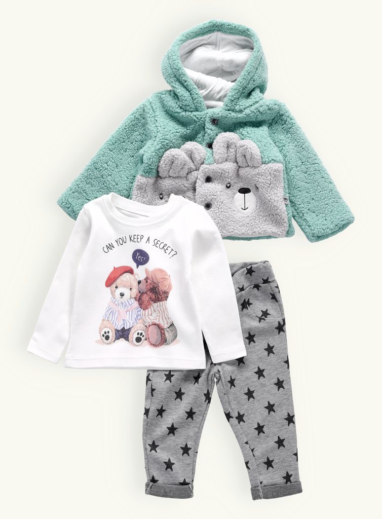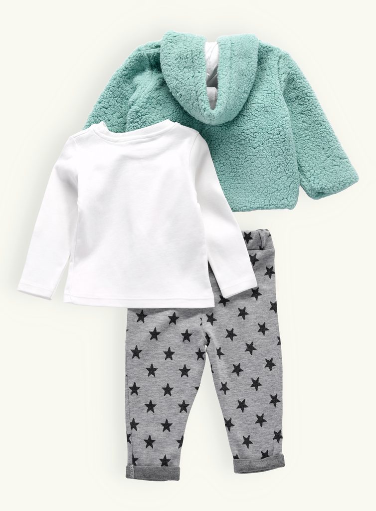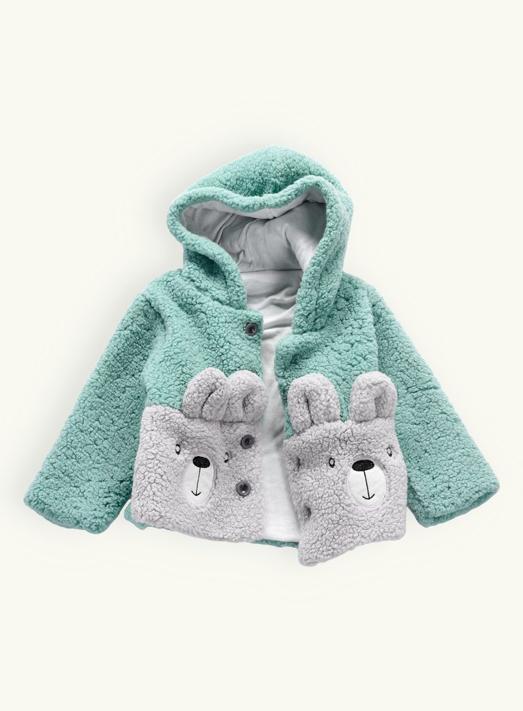 - mikina: plyšová s kapucí, zapínání na knoflíky, bavlněná podšívka, nášivky vpředu