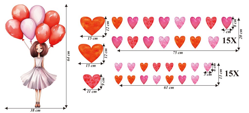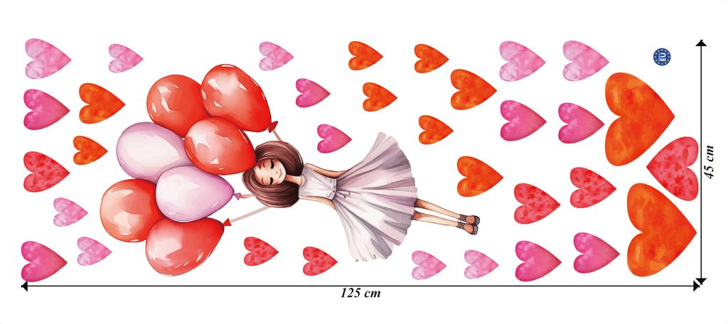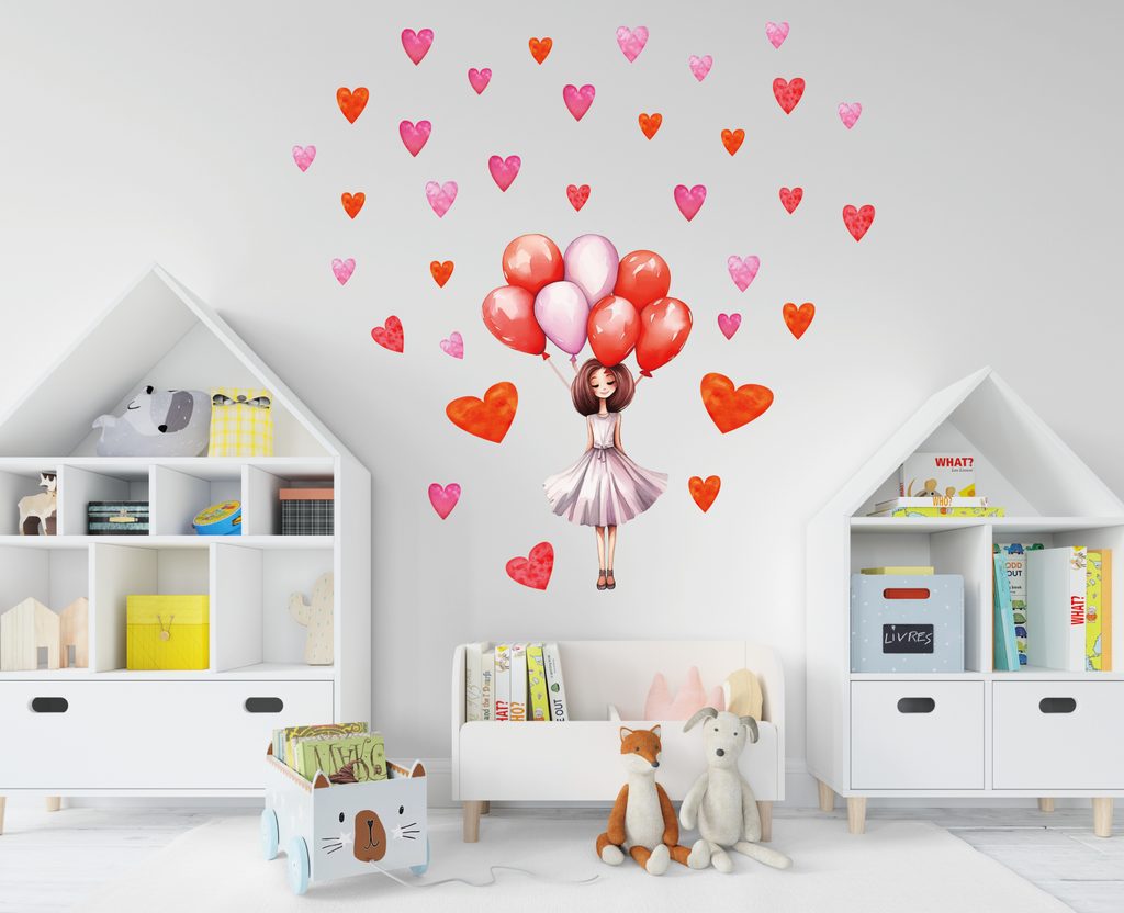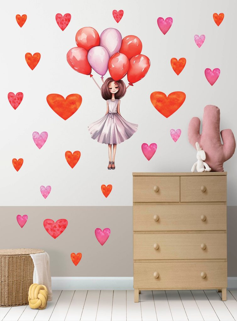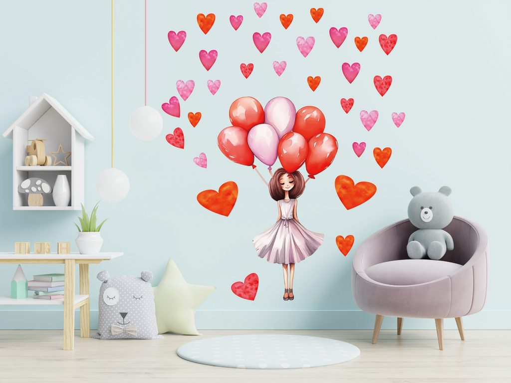 Rozjasněte dětský pokoj těmito okouzlujícími samolepkami, které navozují pocit radosti. Červená srdíčka dodávají samolepce něžný a romantický nádech. Samolepka s motivem dívky v objetí červených balónků je ideální do pokoje každé malé princezny. Vytvořte jí pohádkový koutek, ve kterém se bude cítit výjimečně.