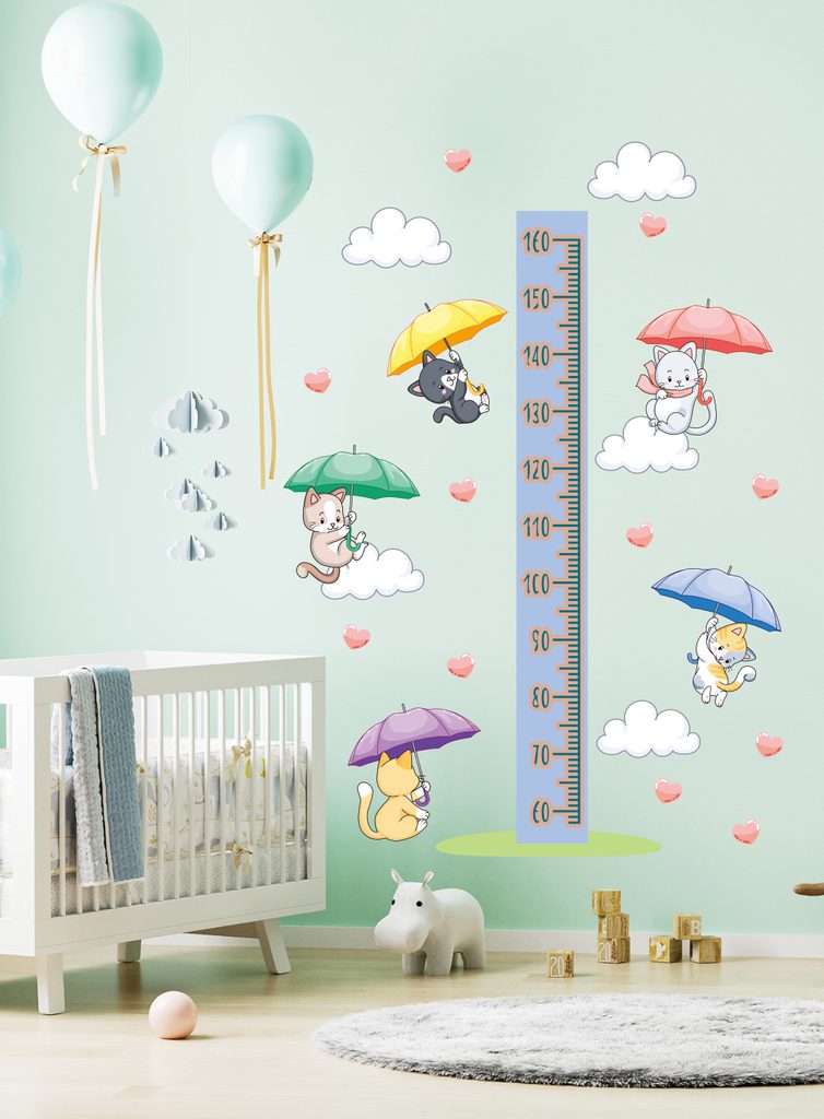 Sledujte, jak vaše dítě roste spolu s našimi zábavnými kočkami! Tento barevný a báječný růstový metr je skvělým doplňkem do každého dětského pokoje. Barevné deštníčky stimulují dítě k tomu, aby