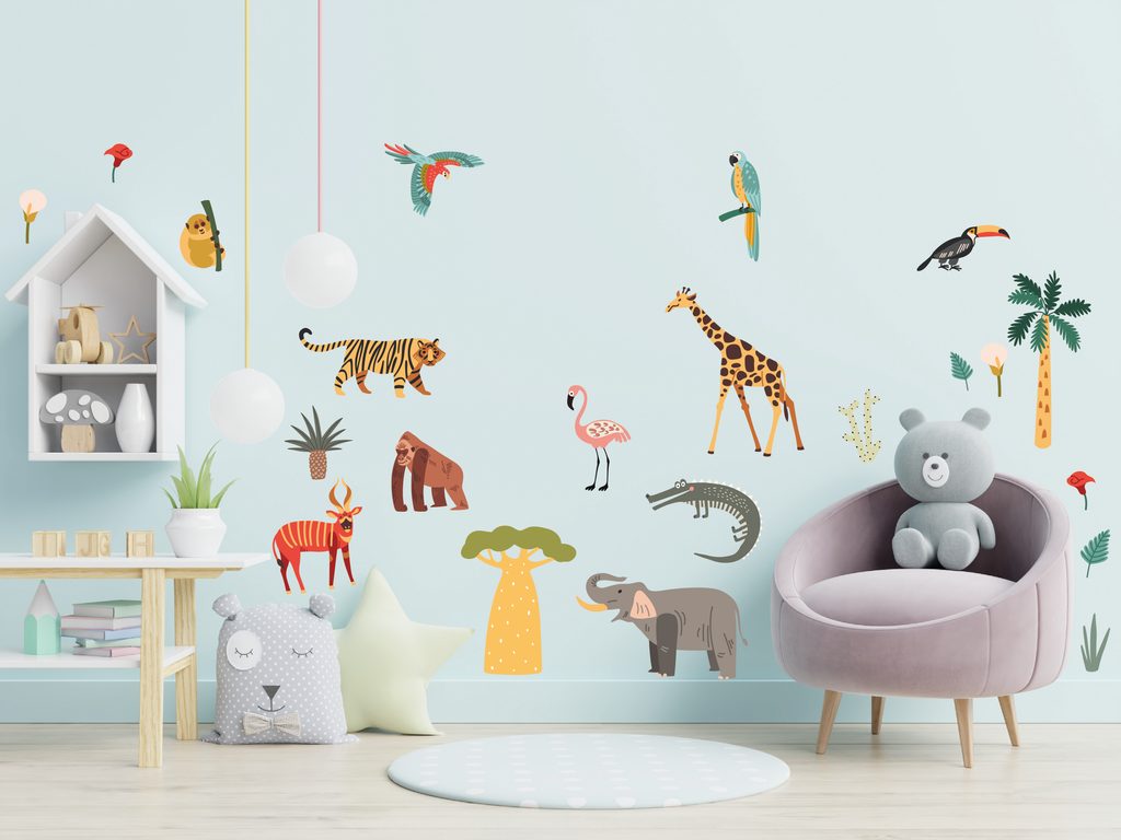 Vydejte se s námi na dobrodružnou výpravu do Afriky! Naše samolepky na zeď s exotickými zvířaty, jako jsou sloni, žirafy, tygři a papoušci, rozzáří každý dětský pokoj. Nechte svou fantazii putovat do africké savany.