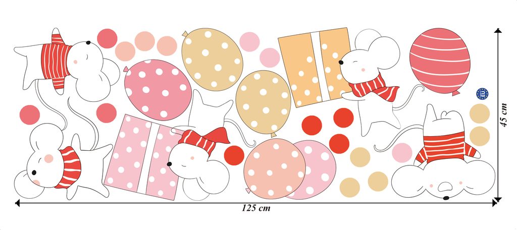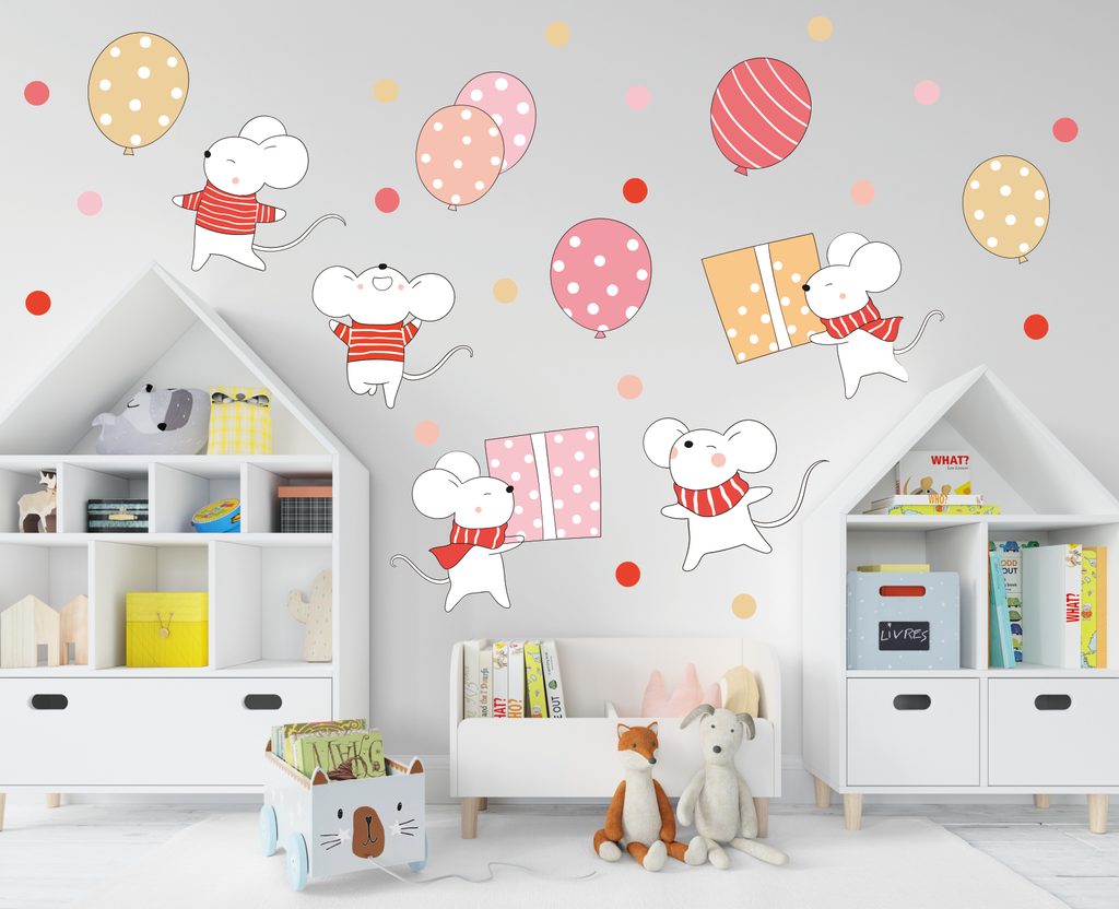 Proměňte dětský pokoj v barevnou párty! Naše samolepky na zeď s veselými myškami, balónky a dárky jsou dokonalým doplňkem do každého dětského pokoje, který se těší na oslavu. Živé barvy, detailní obrázky a roztomilé myšky vytvoří jedinečnou atmosféru a rozproudí dětskou fantazii.