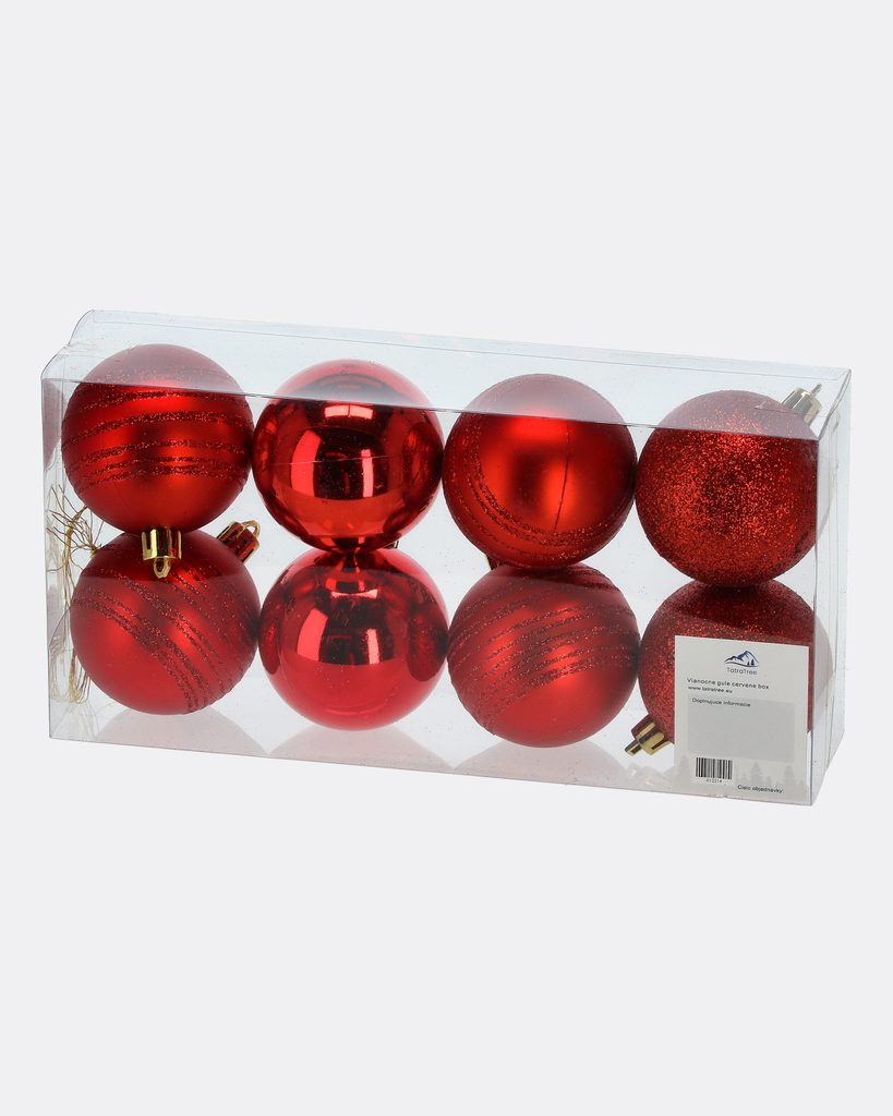 Zvolte klasickou eleganci s touto sadou osmi červených vánočních koulí. Balení obsahuje kombinaci lesklých a třpytivých povrchů, které na vašem stromečku vytvoří bohatý a harmonický vzhled. Každá koule má průměr 6 cm a je vyrobena z lehkého a odolného plastu. Koule jsou dodávány v praktické průhledné krabičce, takže se nepoškodí a po svátcích je můžete snadno uložit.