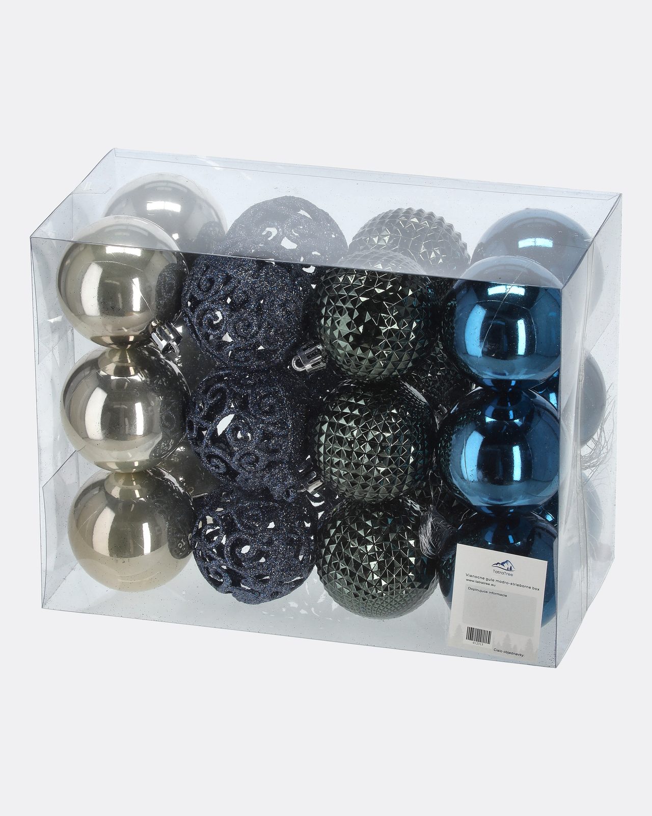 Oblečte svůj stromeček do stylového a moderního outfitu s touto sadou vánočních koulí v elegantní modrostříbrné kombinaci. Toto praktické balení obsahuje 24 koulí ve směsi různých barev, povrchových úprav a textur, včetně lesklých, třpytivých a ažurových vzorů. Díky průměru 6 cm jsou ideální pro vytvoření bohaté a vizuálně zajímavé vánoční výzdoby.