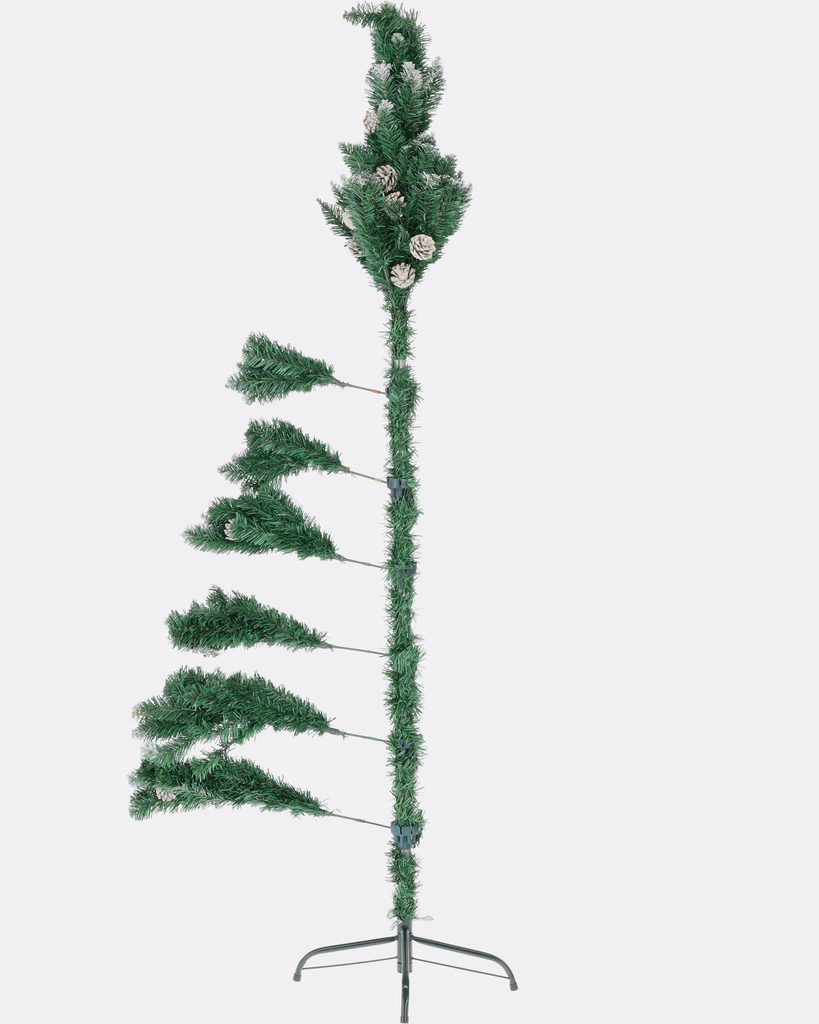 Stromek má husté jehličí sytě zelené barvy, které je bohatě pokryto jemným bílým sněhem. To vytváří působivý vizuální efekt a dojem čerstvě napadaného sněhu. Na větvích jsou již připevněny přírodní šišky s bílými špičkami, které krásně splývají se sněhem a dodávají stromku autentický lesní vzhled.