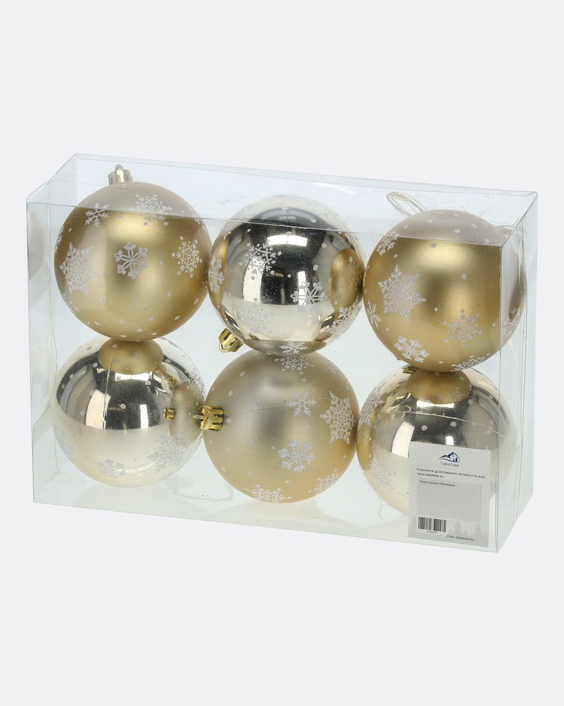 Rozzařte svůj stromeček a domov touto sadou šesti zlatých vánočních koulí. Každá koule má lesklý povrch a je zdobena decentními bílými sněhovými vločkami a tečkami, které vytvoří kouzelnou zimní atmosféru.